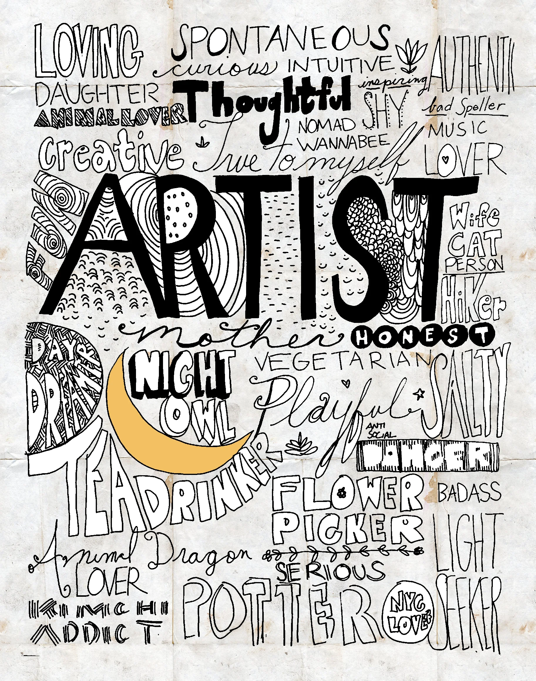 Next, on drawing paper, sketch out your words in pencil, using as many different fonts as you can come up with and in different sizes. Feel free to add doodles of any kind to your sketch. Once you have sketched it all out in pencil you can go in with pen and outline your marks.