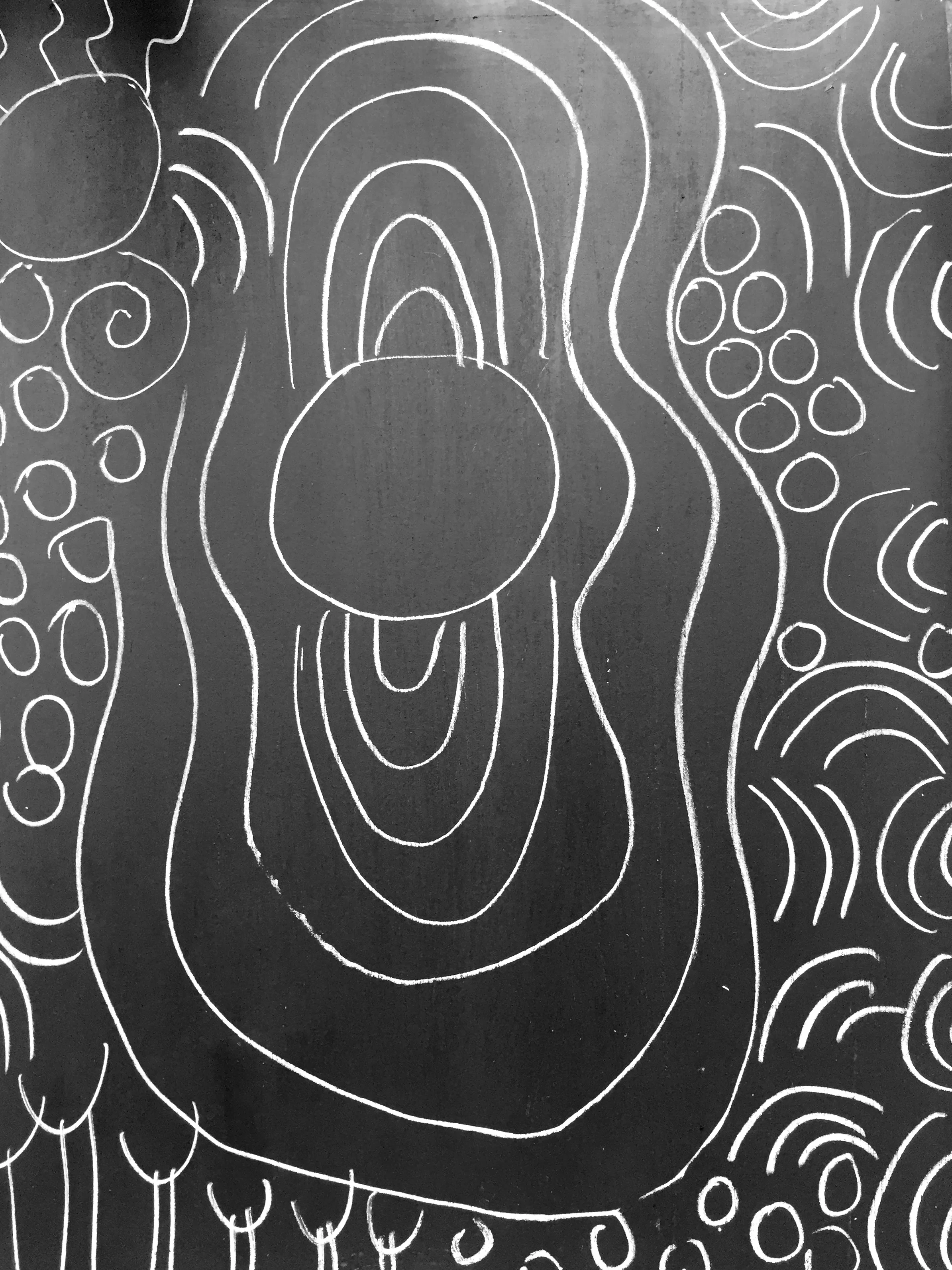 For this exercise you will use color, symbols, and designs to make up an Aboriginal inspired painting. I started by using black gesso on paper, then I used a white charcoal pencil to map out my designs. From these I used colored gesso, chopsticks, and paint brushes to create my inspired painting.