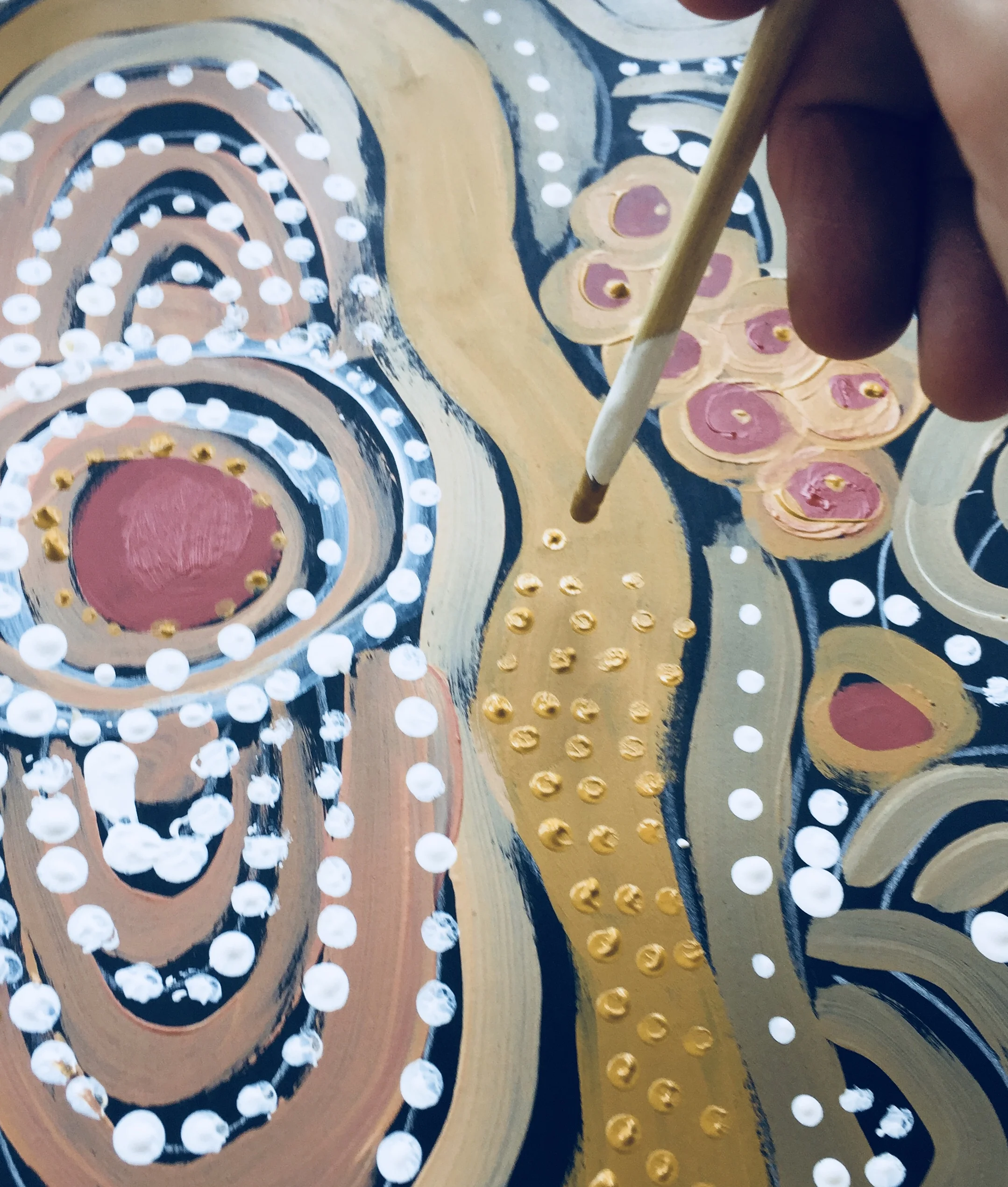 Dots are often one of the most recognizable designs used in aboriginal art. Dot paintings are actually arial views of the land from above. Stripes and lines are also used to paint meaningful symbols.