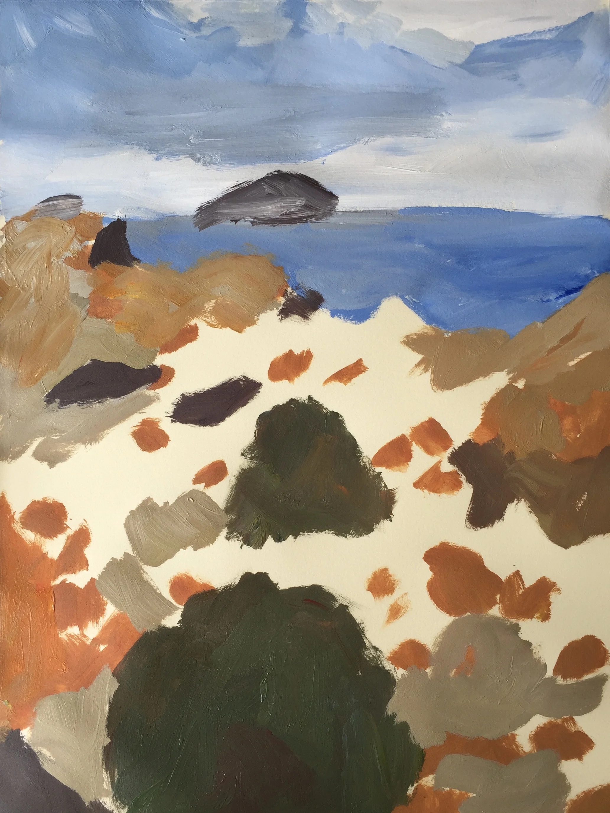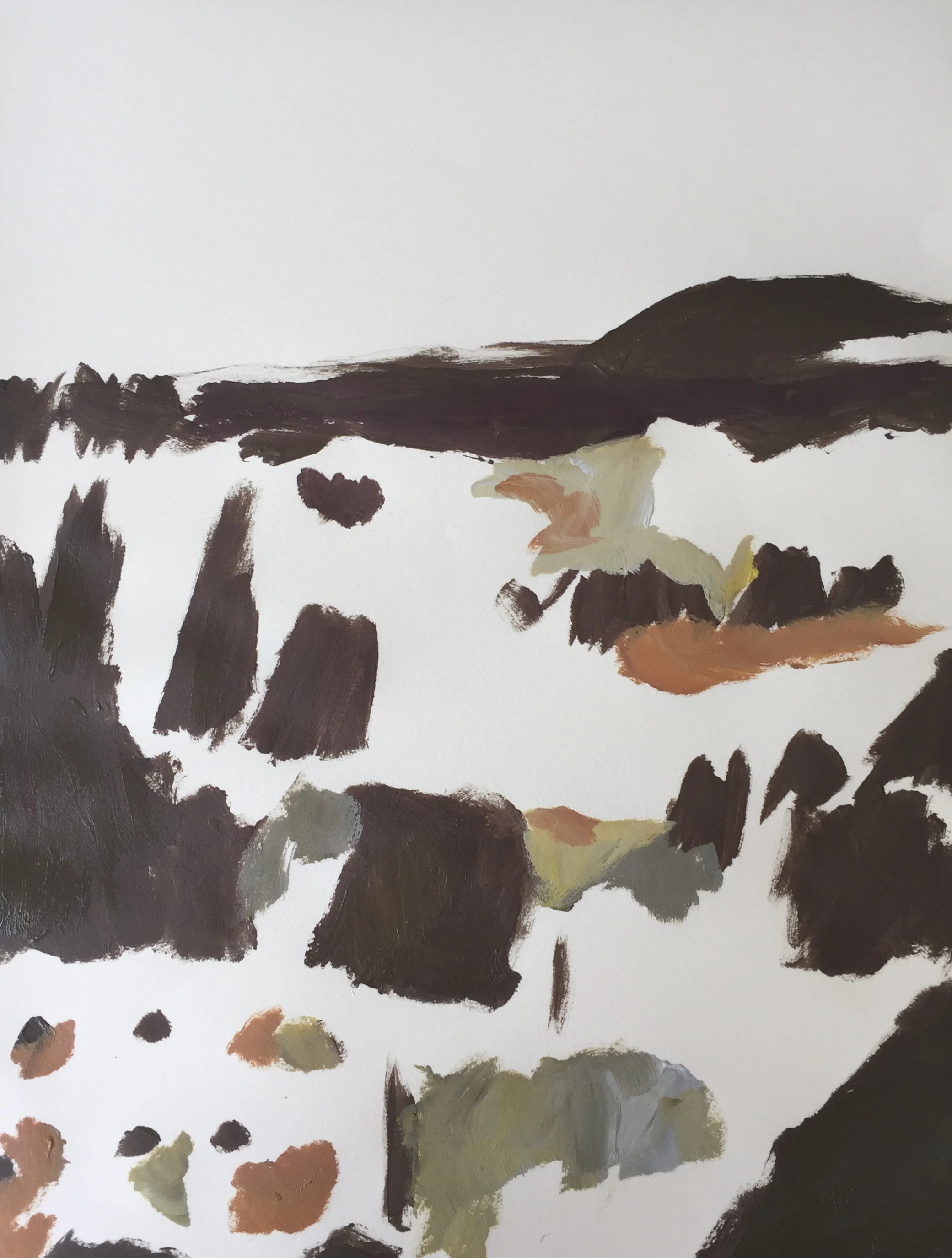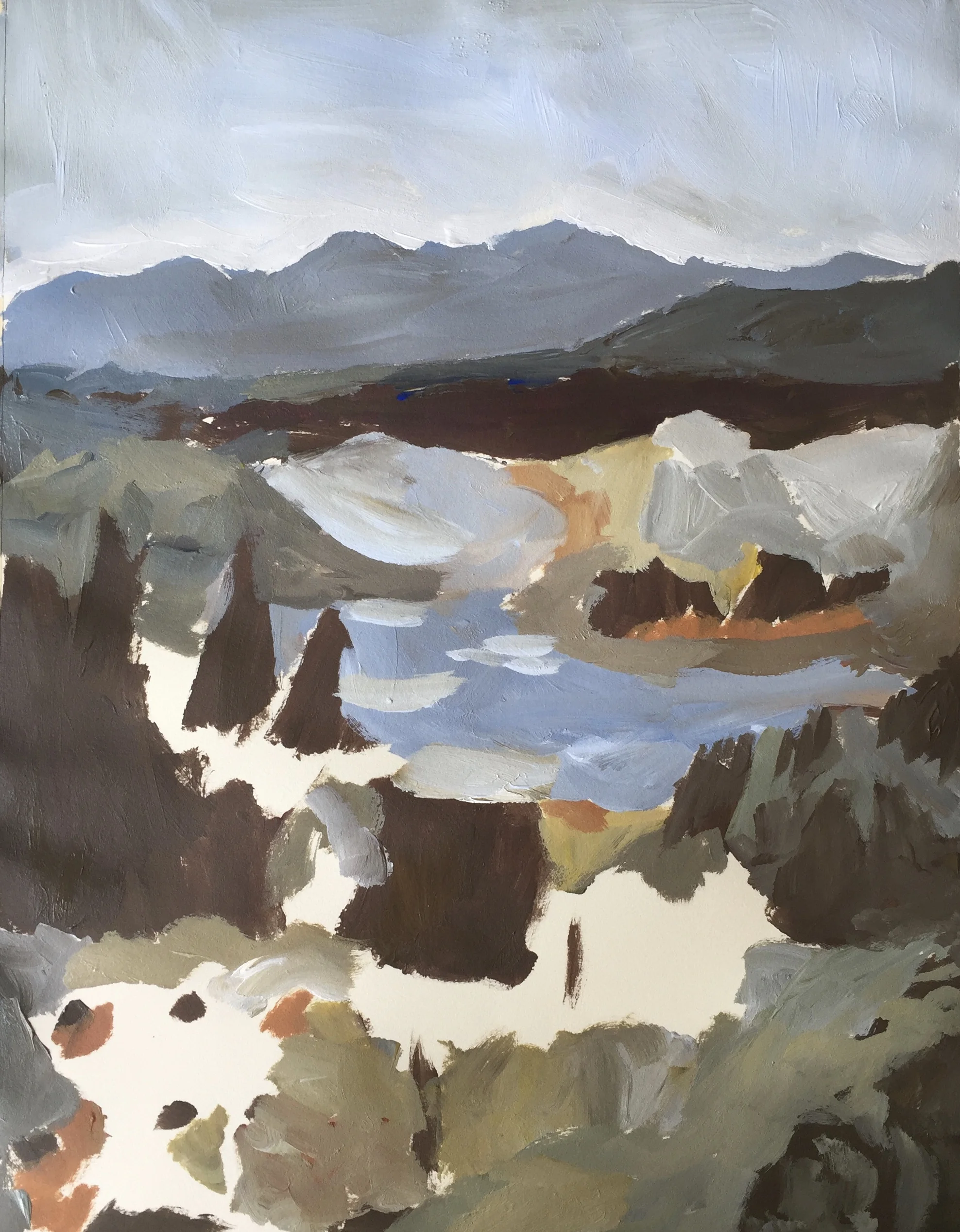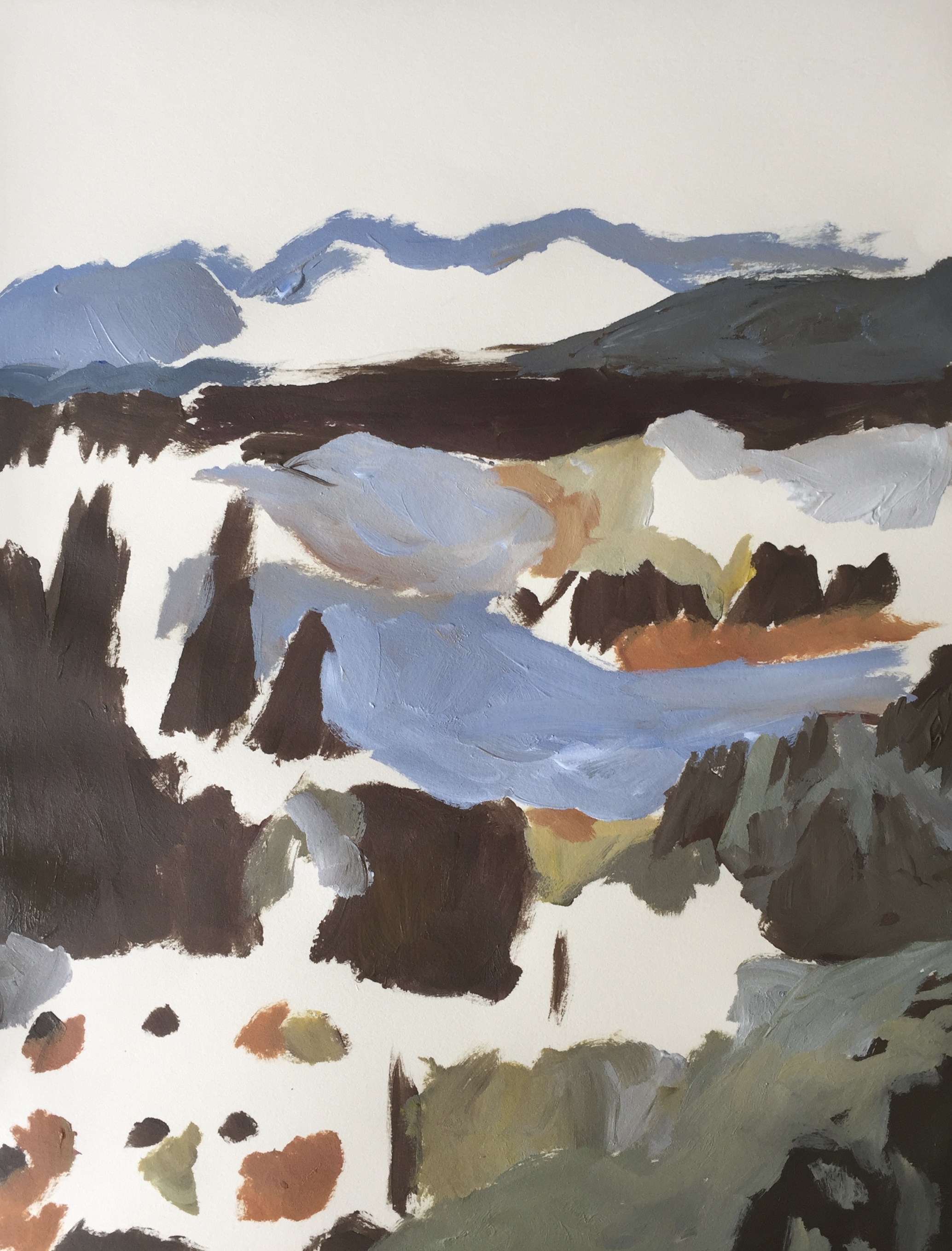 Start off by looking for the different shapes of color, blocking them in as you see them. I kept my paintings very abstract, adding very little detail. If you want more detail in your landscape painting use smaller brushes and spend more time looking for the changes in shape/value/relationships.