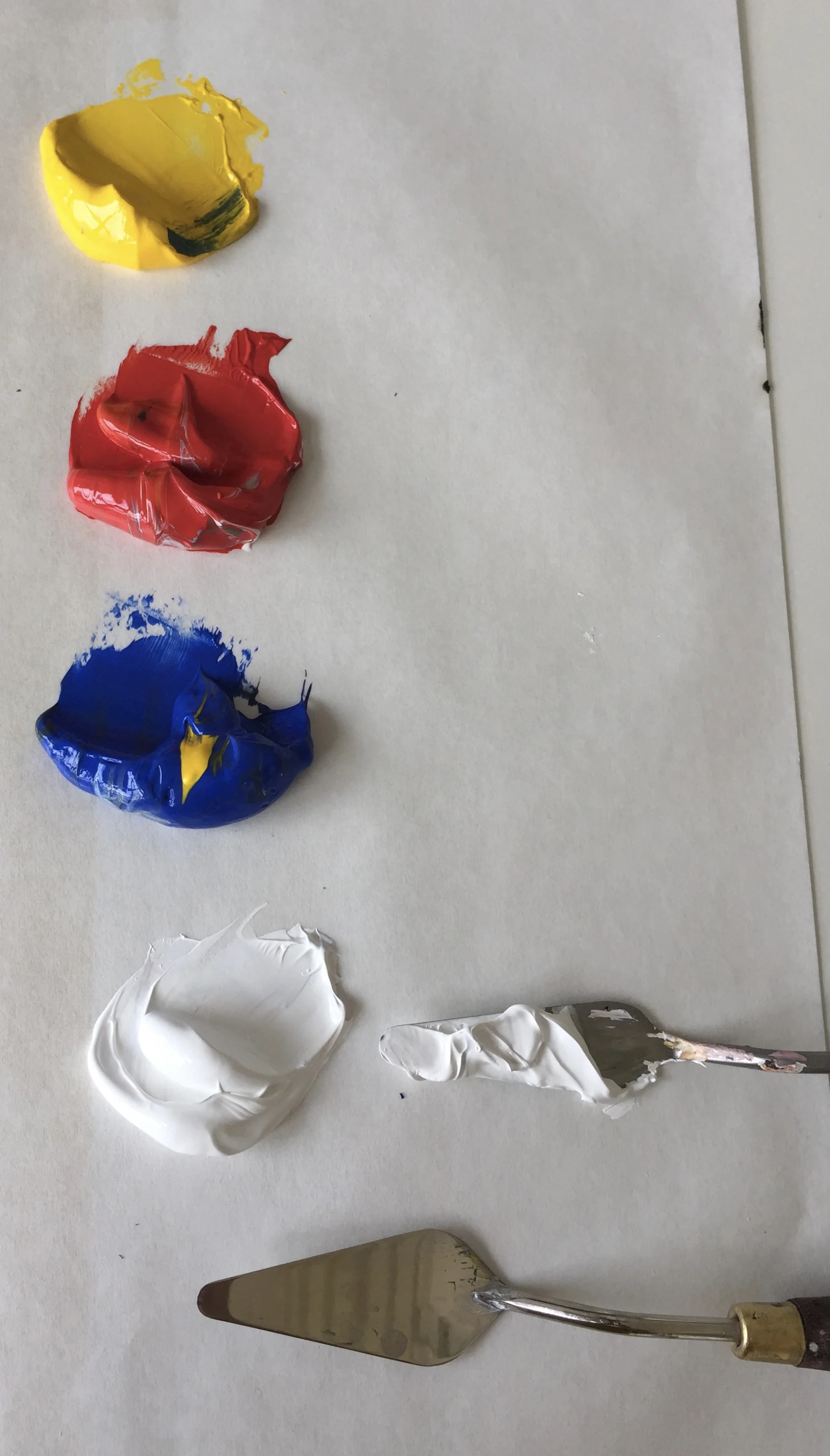 I used the primary colors again. I am kind of hooked on the simplicity of them and the fact that they are really all I need, in addition to white! If you feel they are not enough for you please use any/all the colors you would like. You could even do this exercise with vividly bright - unnatural colors. That would be cool!