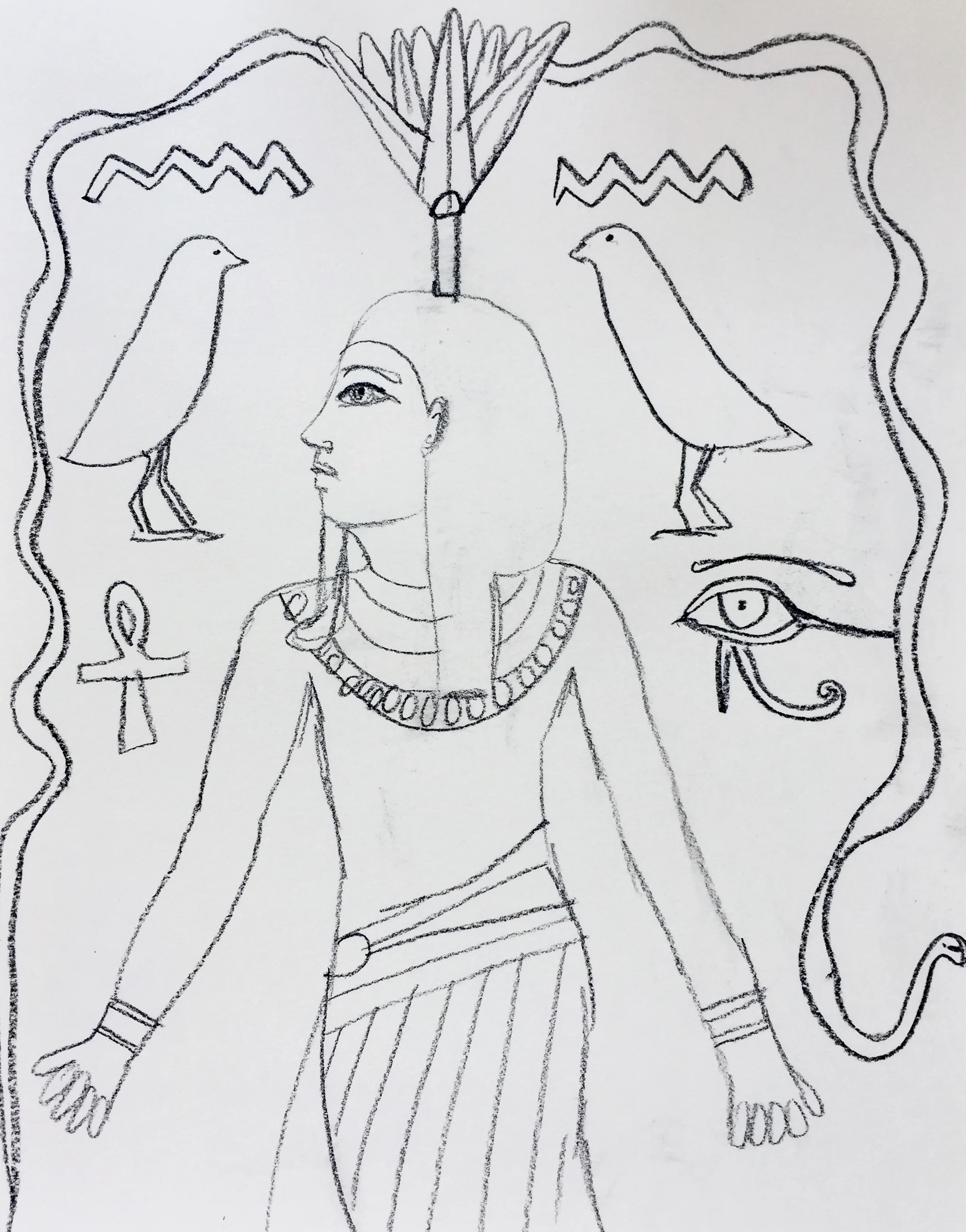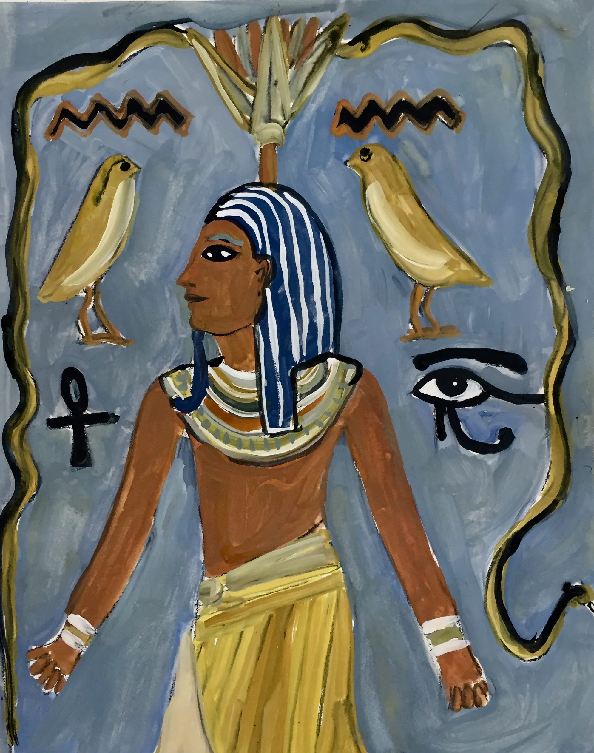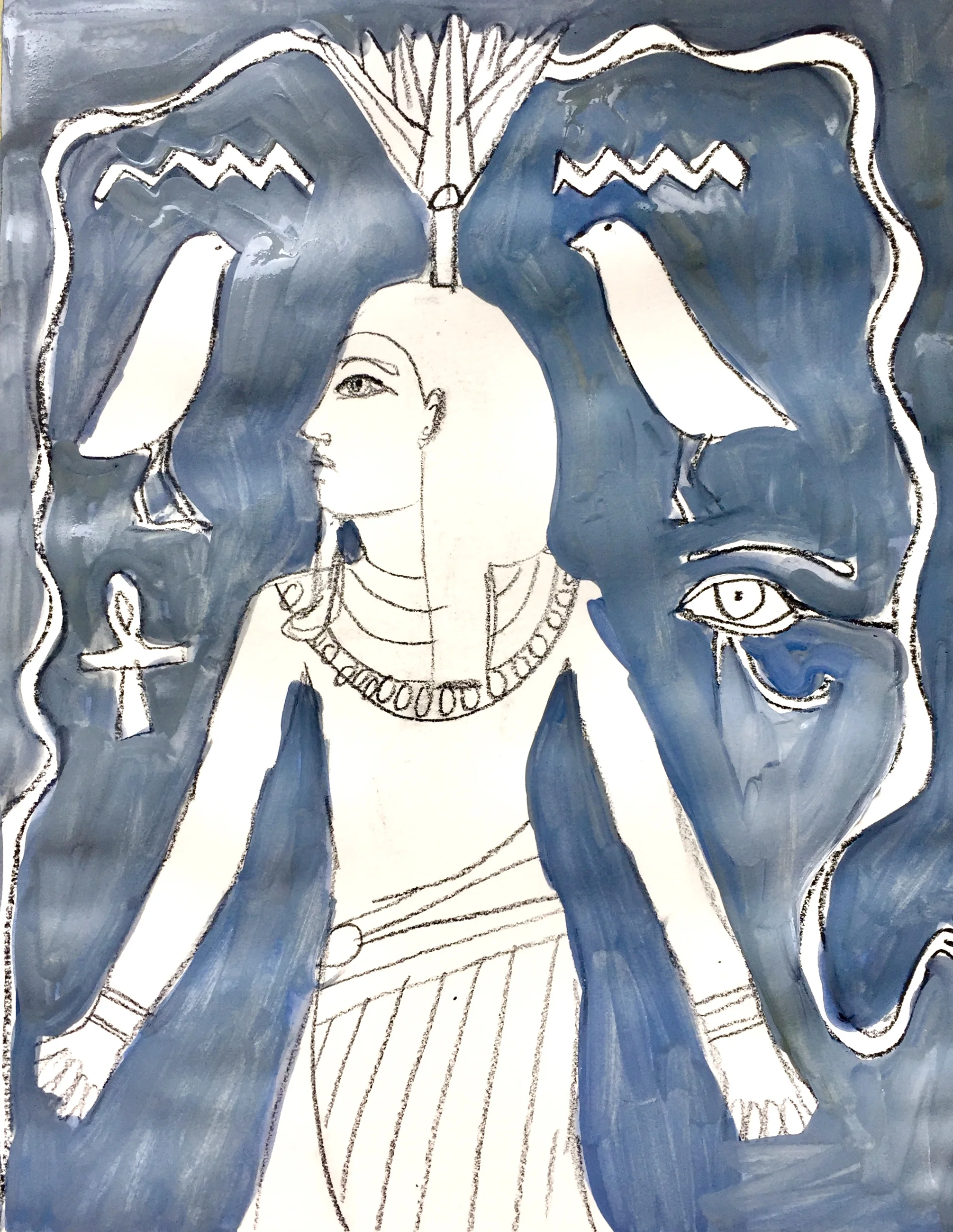 For this exercise, you will need to look for a painting, or a couple of paintings, you love that you'd like to use for inspiration. Sketch out an idea for a painting, using Egyptian symbols and designs. Decide on what kind of paint you'd like to use. I used Gouache for this exercise. Paint your painting in a similar style as the painting you are using for inspiration.