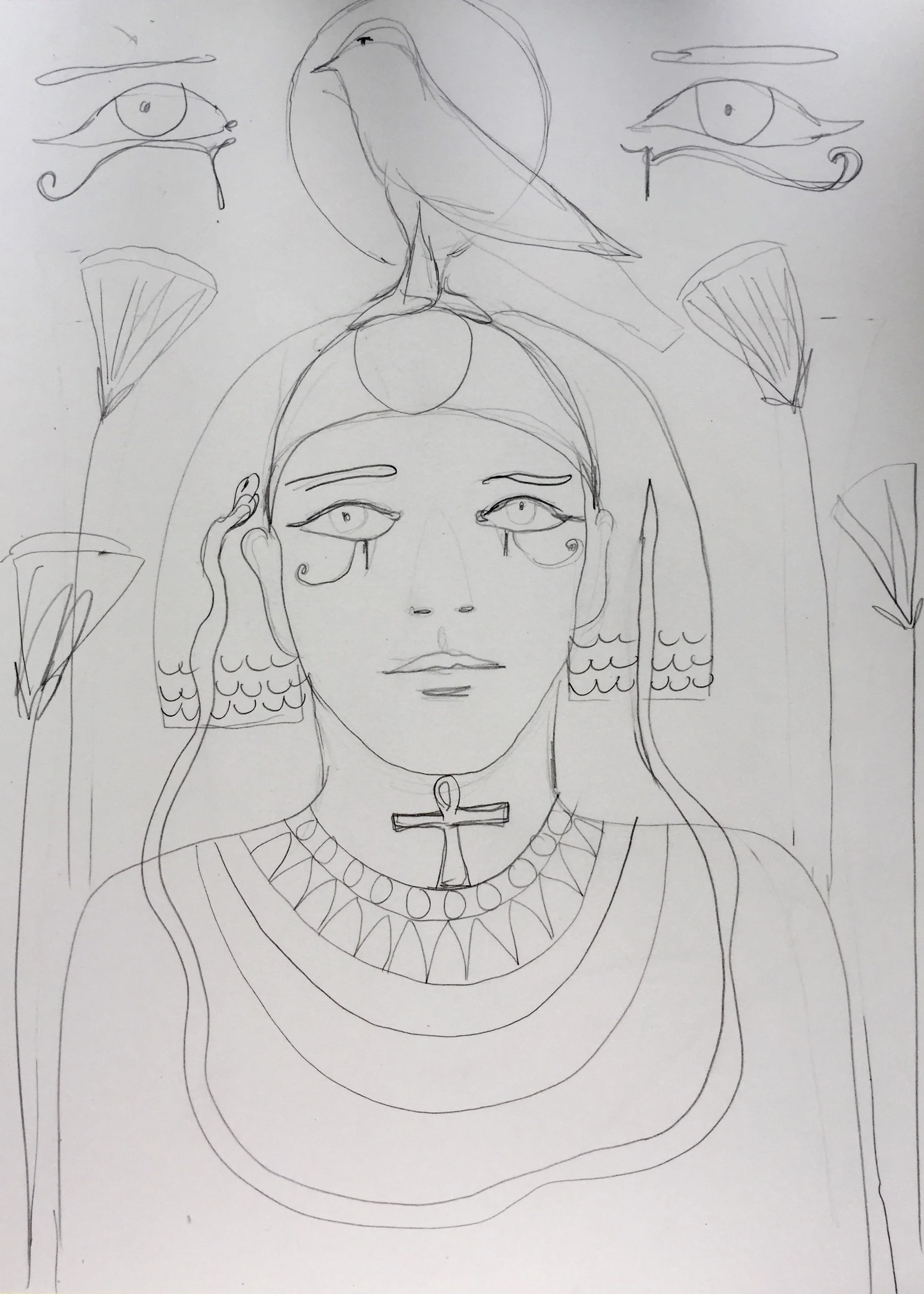 Once you have done the Ancient Egyptian Art exercise you are ready to merge that style with your own style of art. You can use one or several Egyptian paintings/sculptures for inspiration. I used many different paintings. If you aren't sure of what kind of details/designs to use you can check out your local library for books on Egypt.