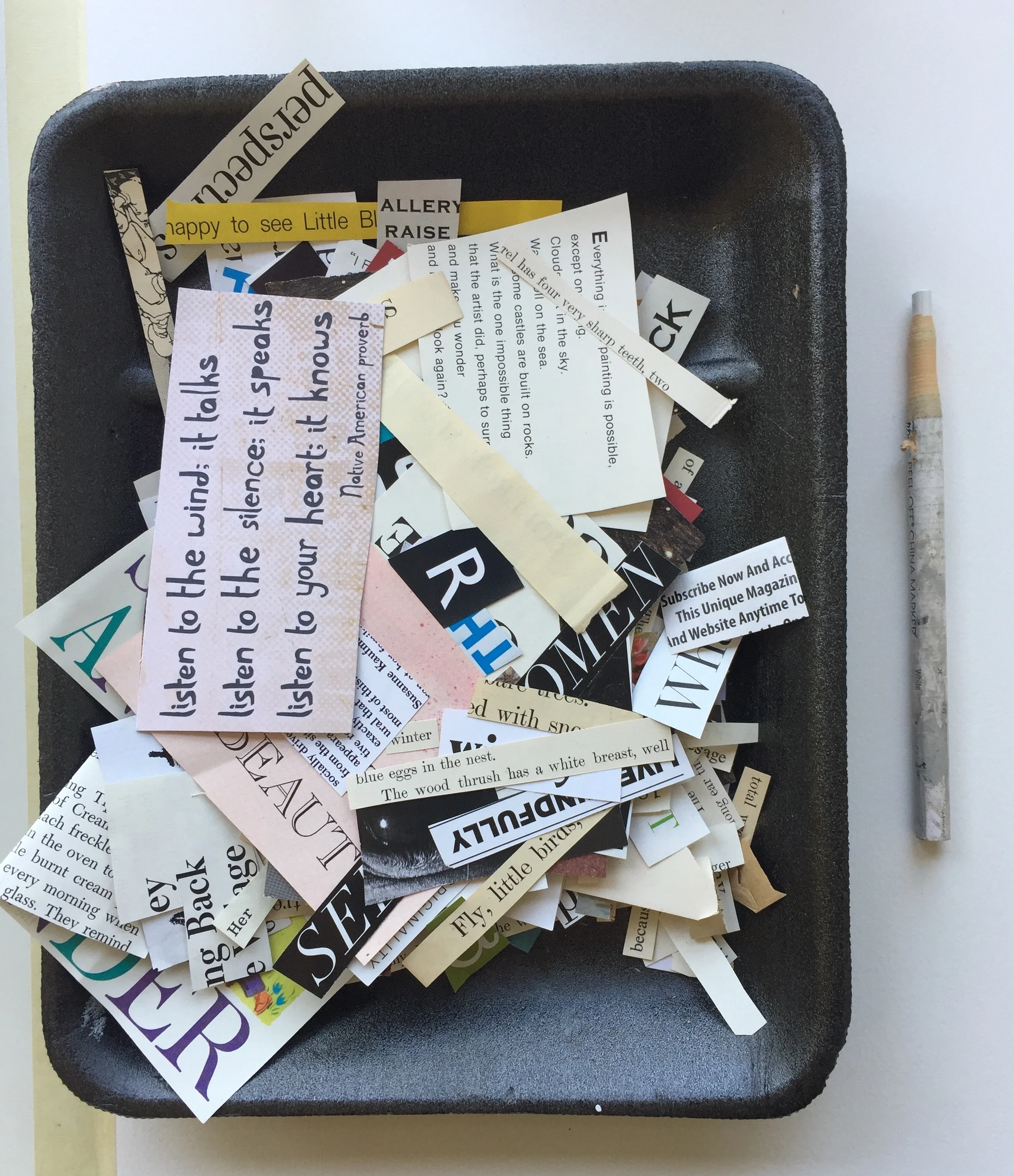 If you don't have a supply of already cut out words I would suggest taking an afternoon or evening and a stack of magazines/old books and start cutting. This is such an enjoyable way to spend a few hours, at least for me. I feel like it's a little bit like looking for beach glass on the shore of a lake, as you search for that perfect word or phrase... okay, so maybe beach glass hunting is a little more enjoyable... either way, they are both great ways to spend some time searching for something...who knows what you'll find!