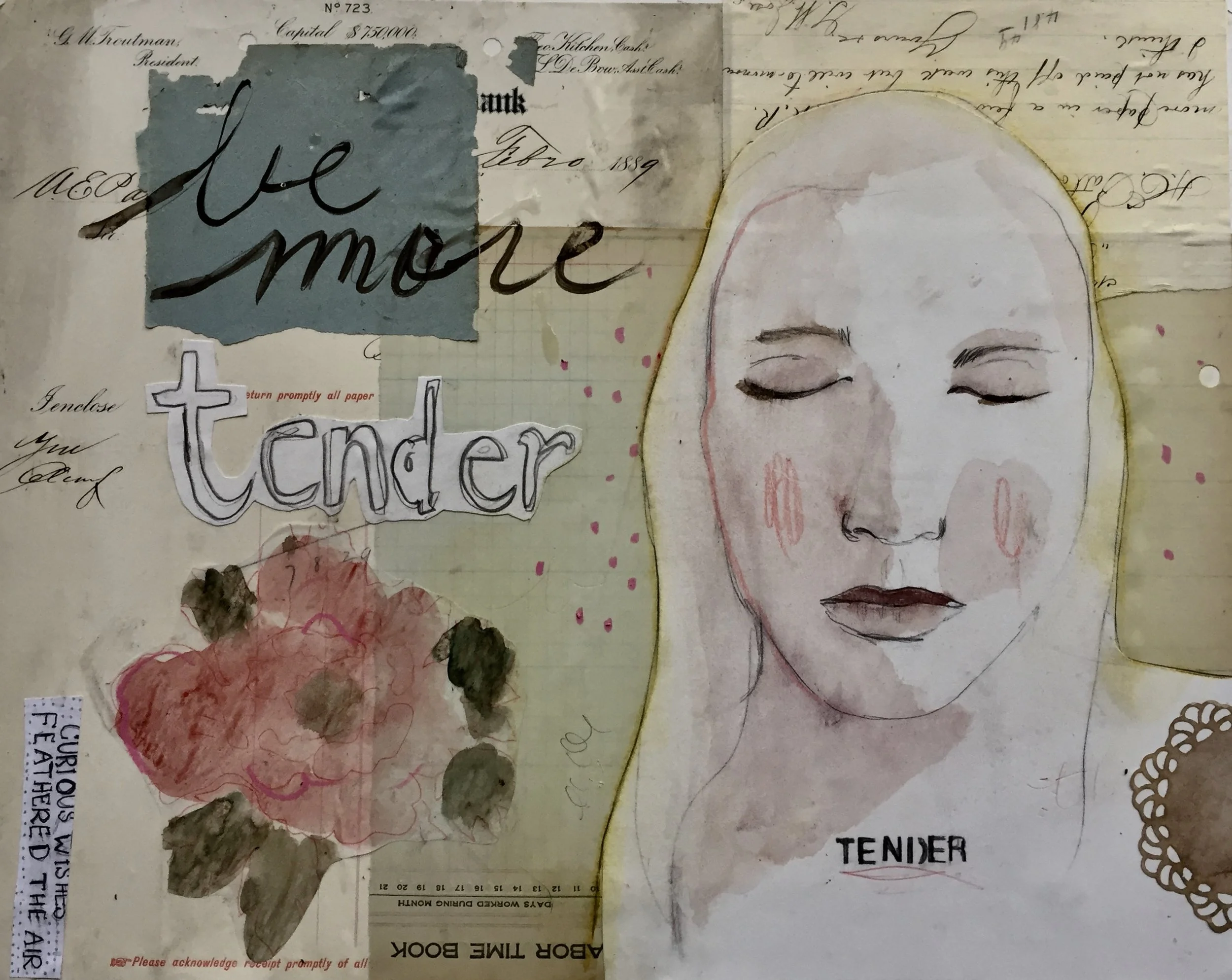 This would be a really great exercise to do in a journal if you would prefer or maybe go big with this one. I worked 11" x 14". I started by putting a layer of collage down on my paper, creating a nice background to build on. From there I drew out the drawing that I wanted to add on top of the collage layer. I added some watercolor paint to add a little color. I then added some cut out words that I wrote out on drawing paper. I used tissue paper to draw out another image and glued it down. From there I continued to add more details with crayons and collage and pencil.