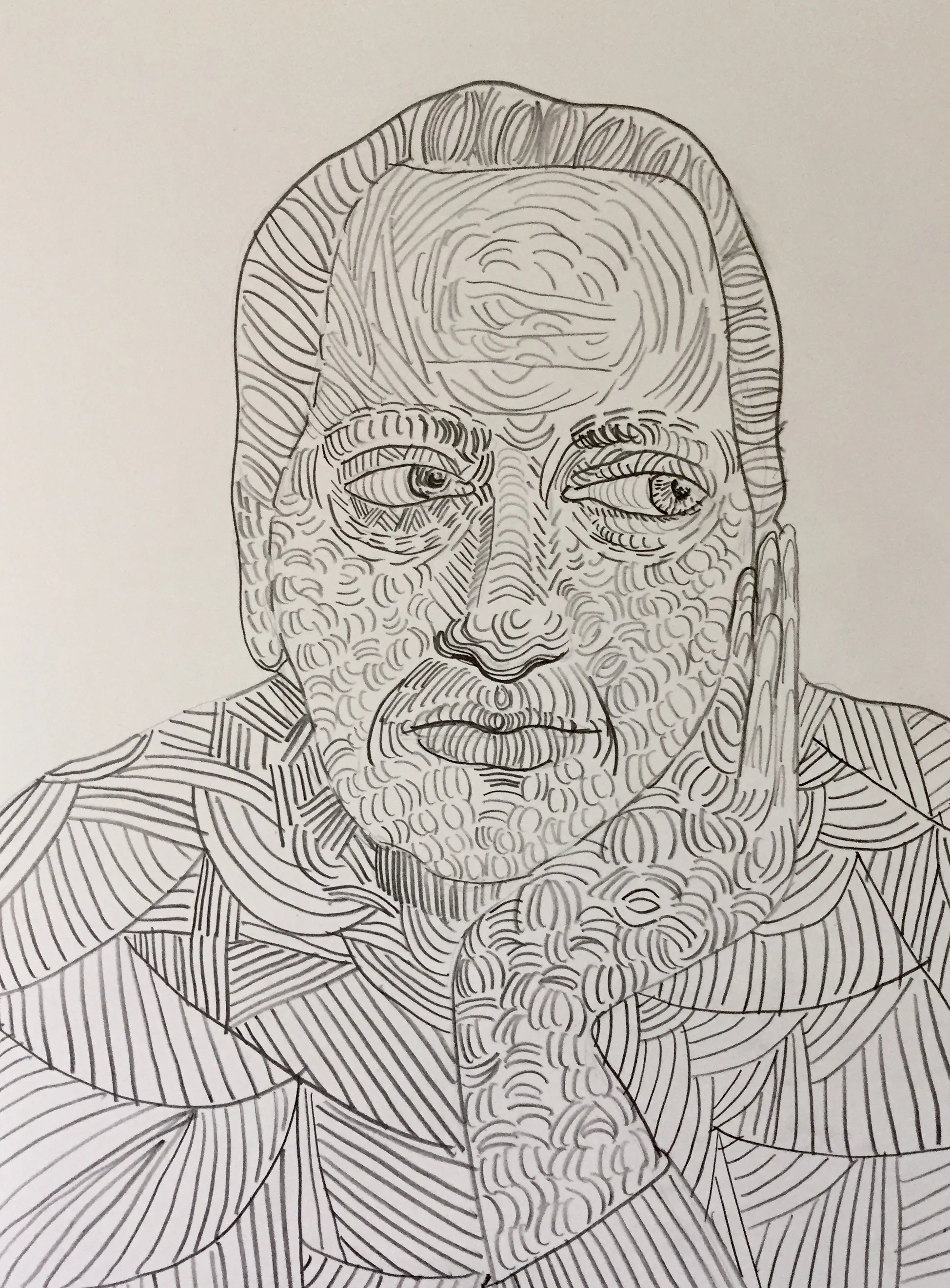 You will need a reference image, you could make it a self portrait if you want to use a mirror or photo of yourself. Lightly sketch it out and then begin to use lines going in all different directions to fill in the portrait.