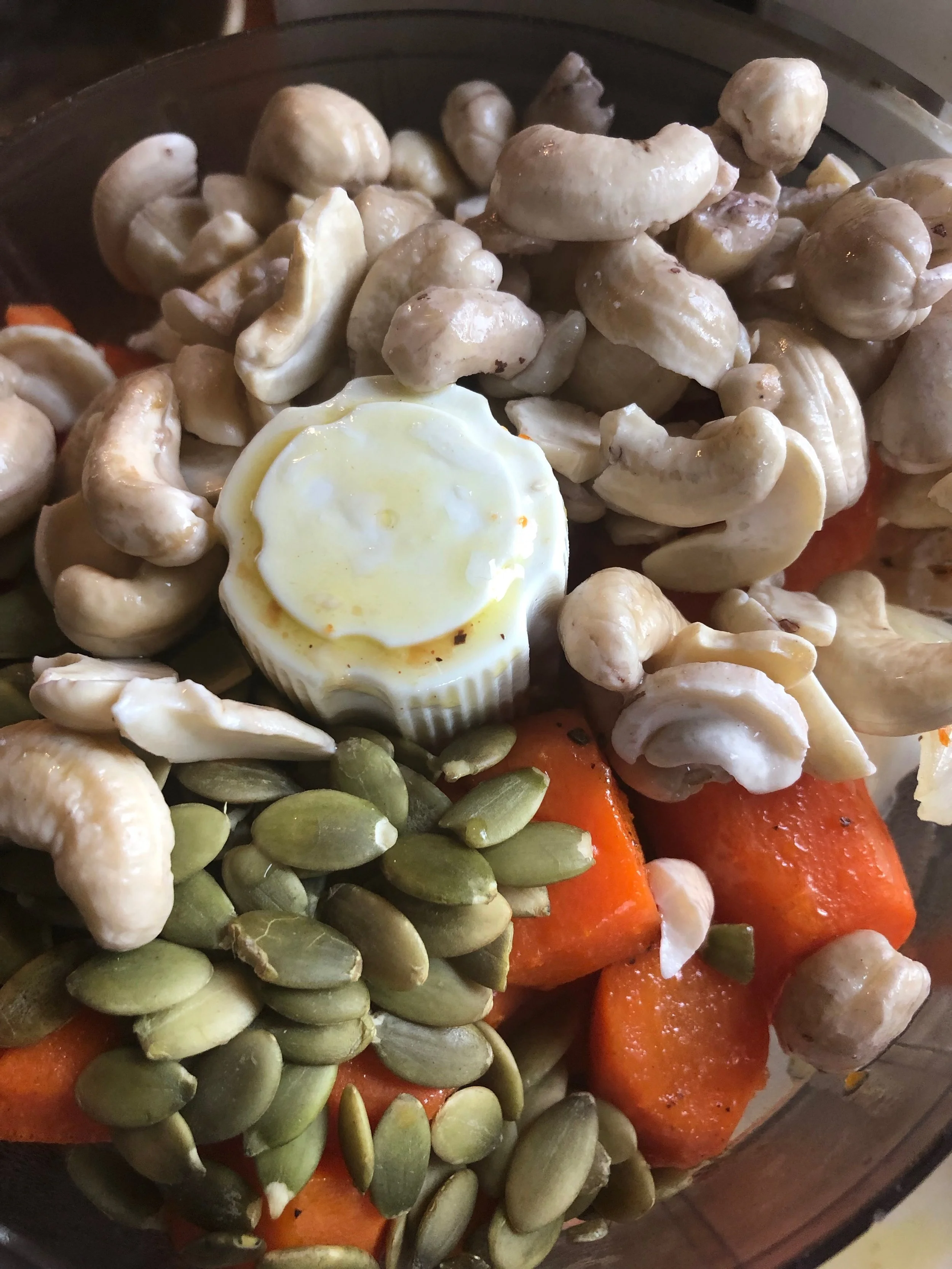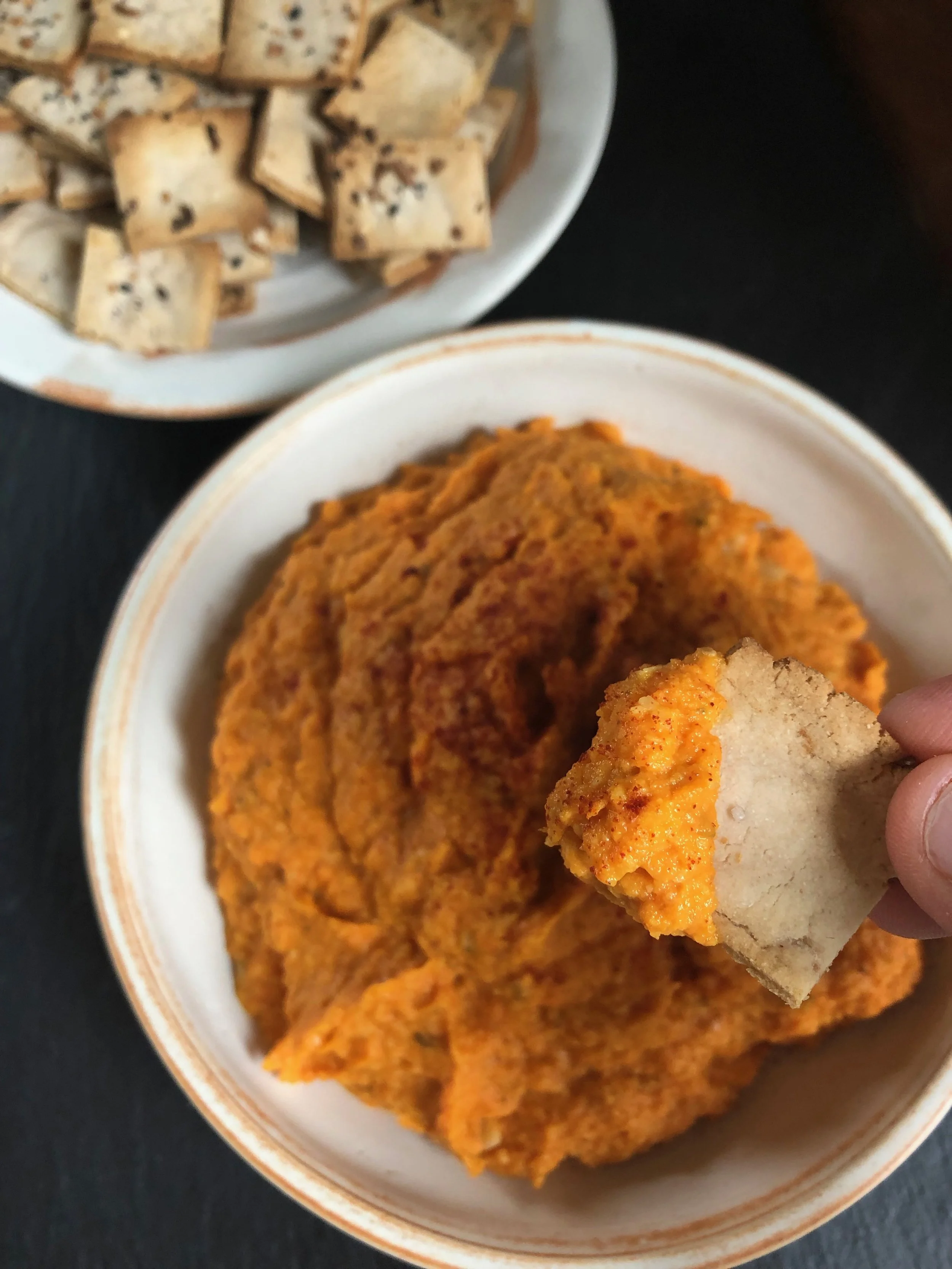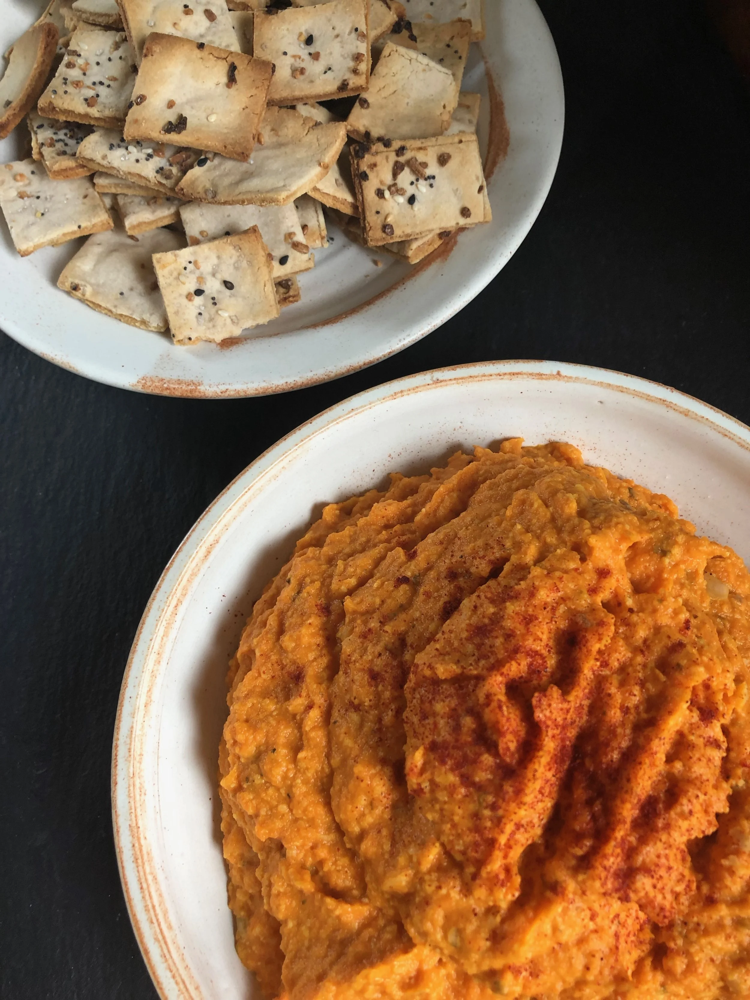 Allow carrots to cool for five minutes. In a food processor, blender, or nutribullet add roasted carrots,onion, and garlic + rest of the ingredients above. Pulse until smooth. Add dip to a bowl and sprinkle with smoked paprika. Serve with crackers + enjoy.