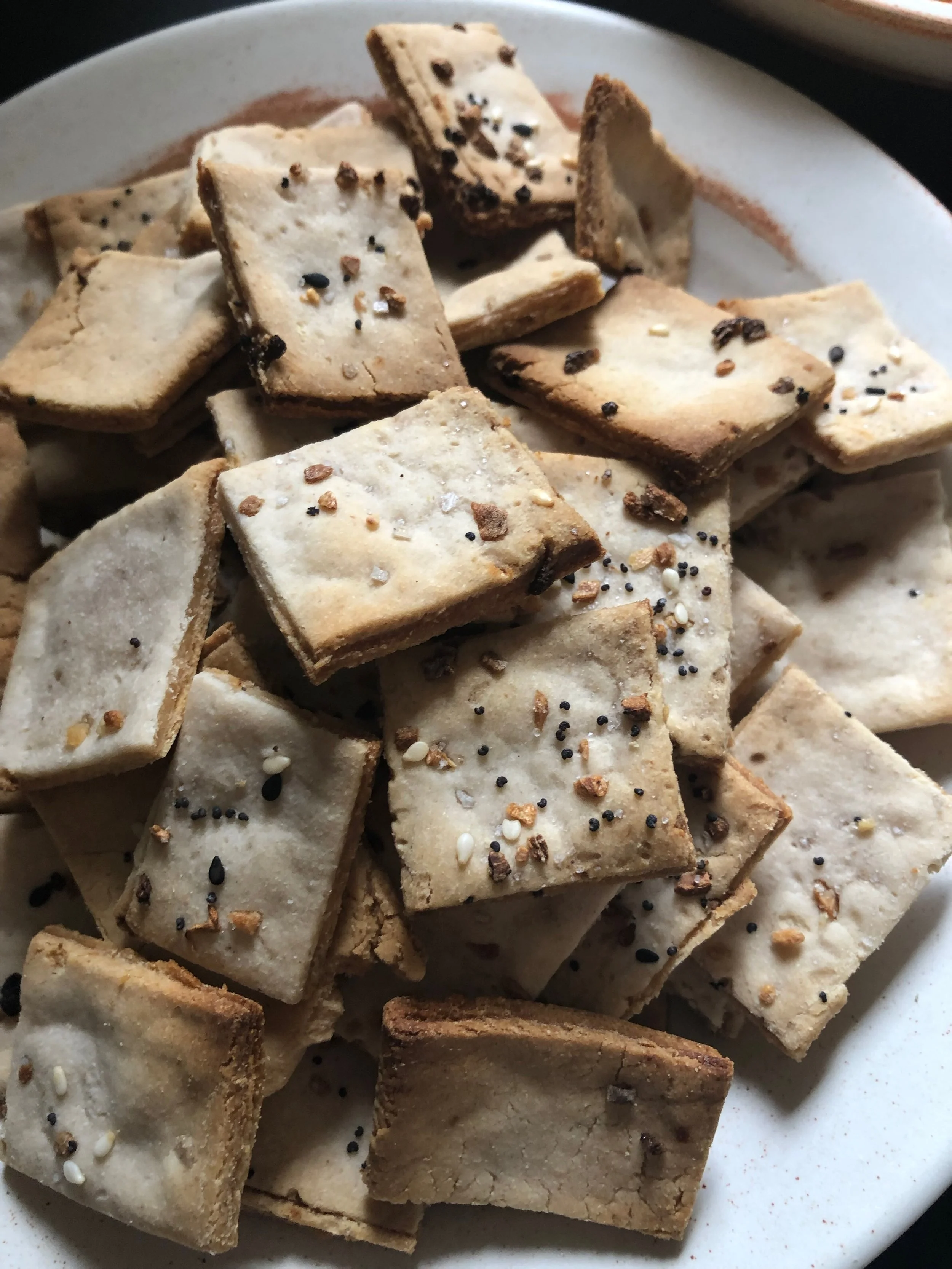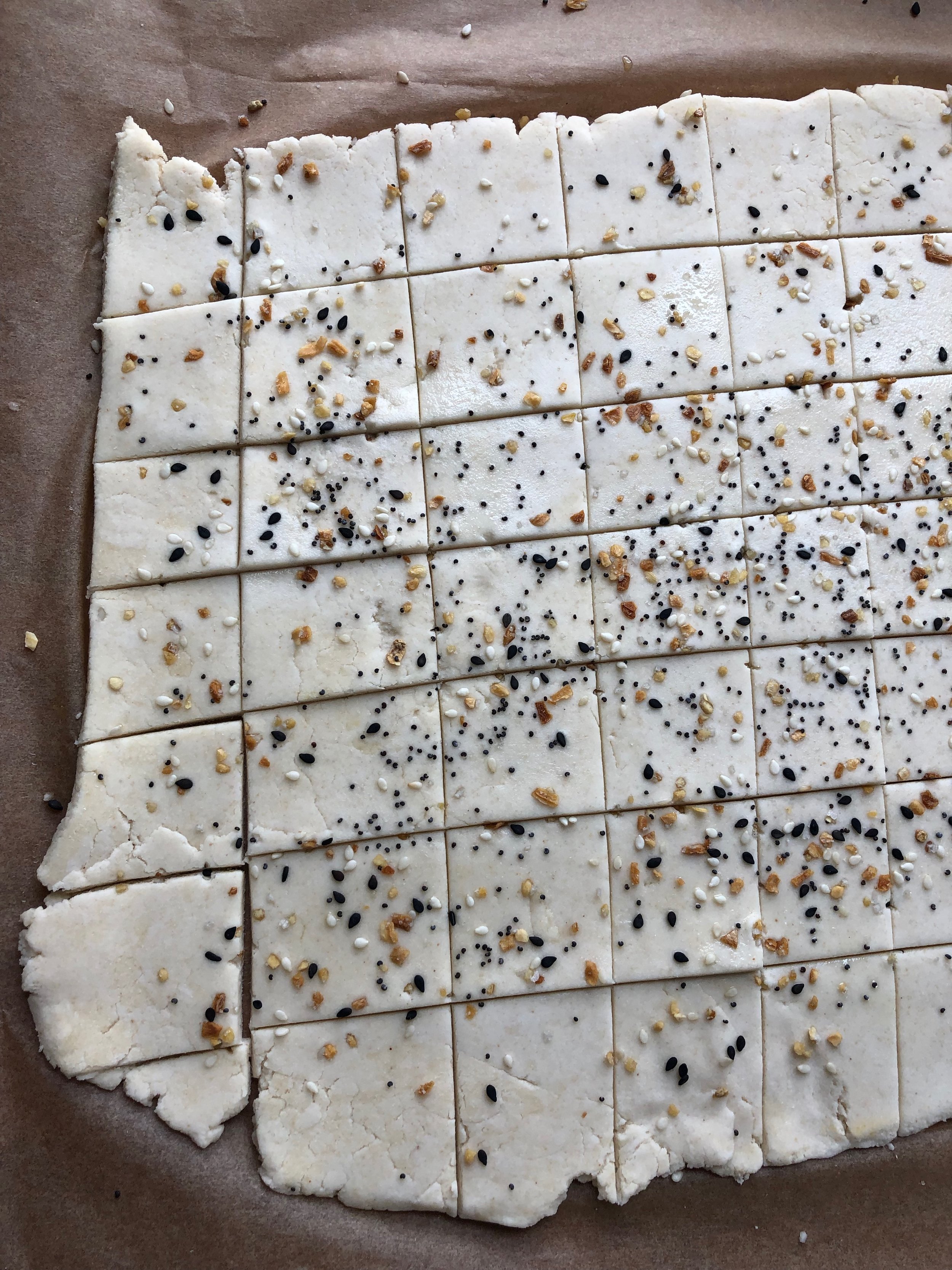 Sprinkle seasoning on top. Gently roll the rolling pin over the seasoning to press it into the crackers. Cut into squares. I had to recut with culinary scissors halfway through baking, the crackers glued themselves back together. To prevent this you can make sure the crackers aren’t touching once cut into squares.