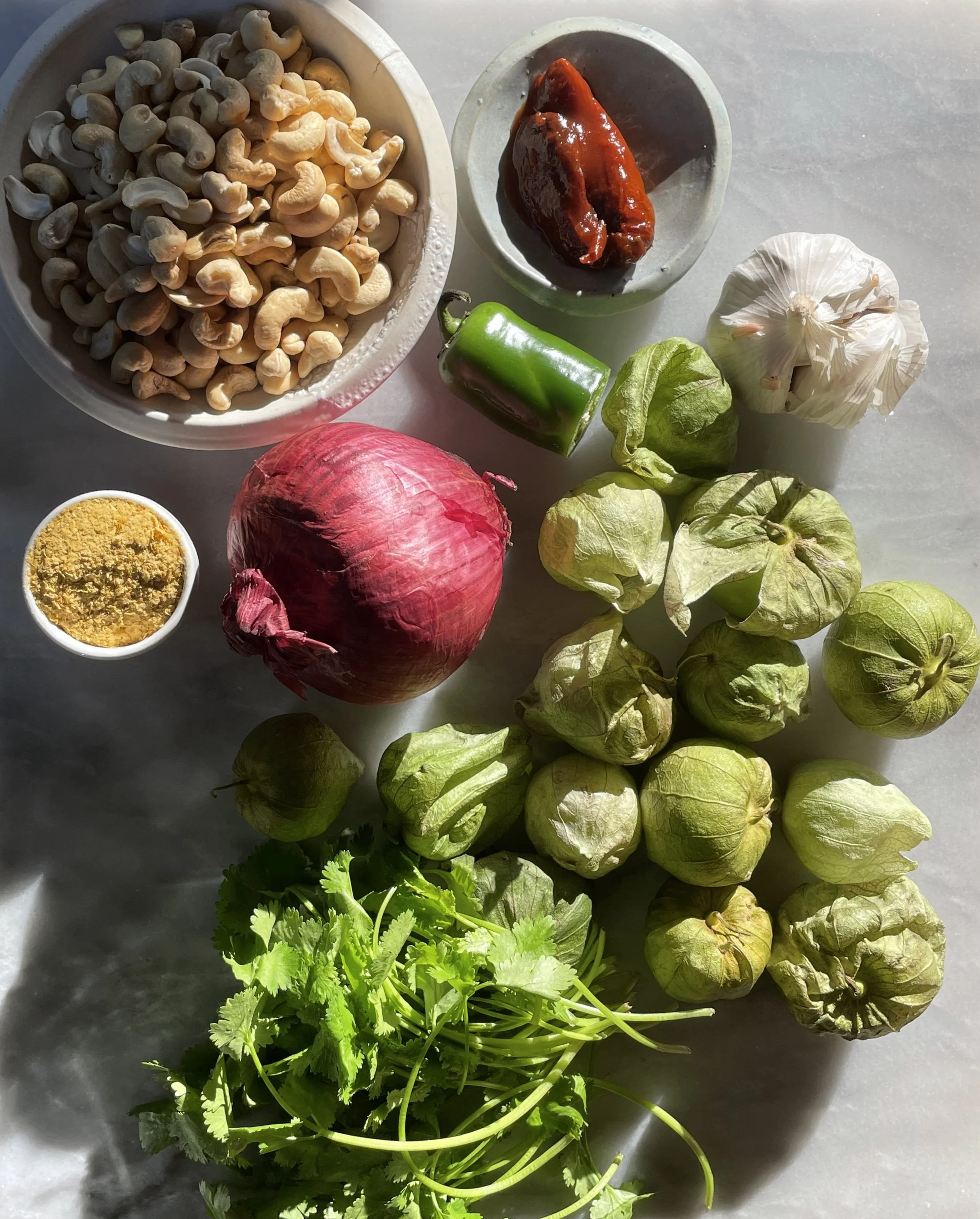 In a blender add the cashews, chipotle peppers, oat milk, turmeric, and salt to the tomatillo mixture, and purée until smooth. If the mixture is too thick add more oat milk. Taste and adjust seasoning with salt, if needed.