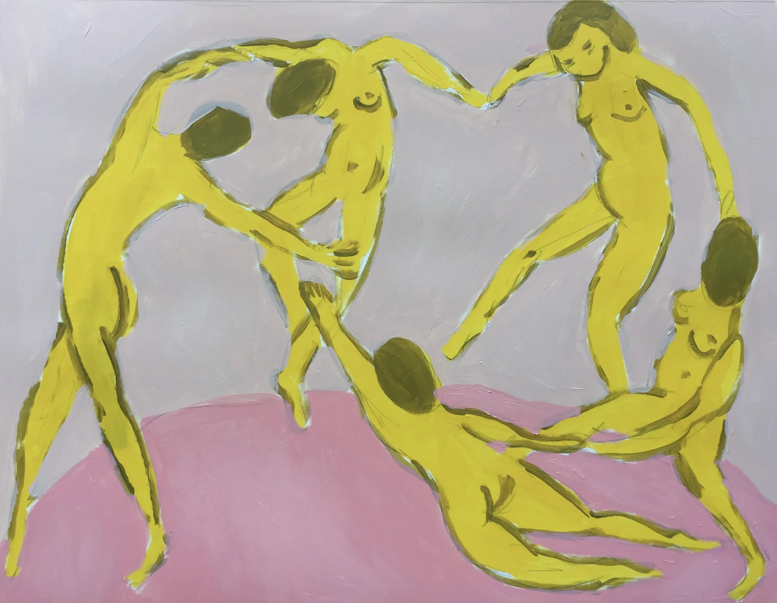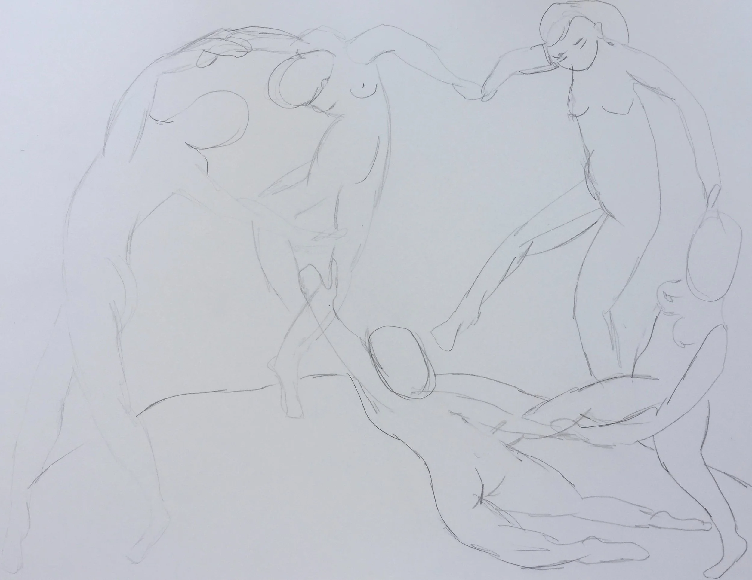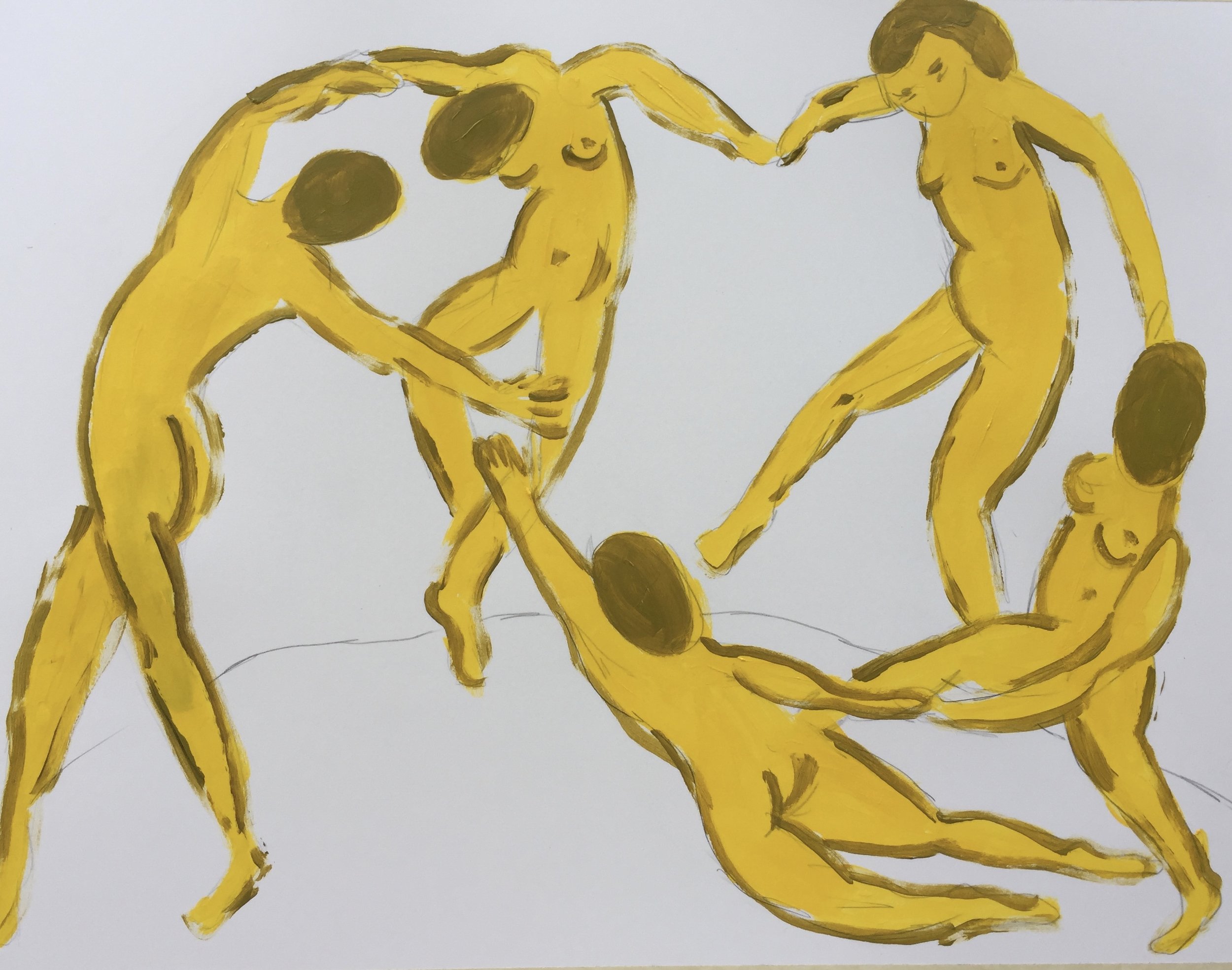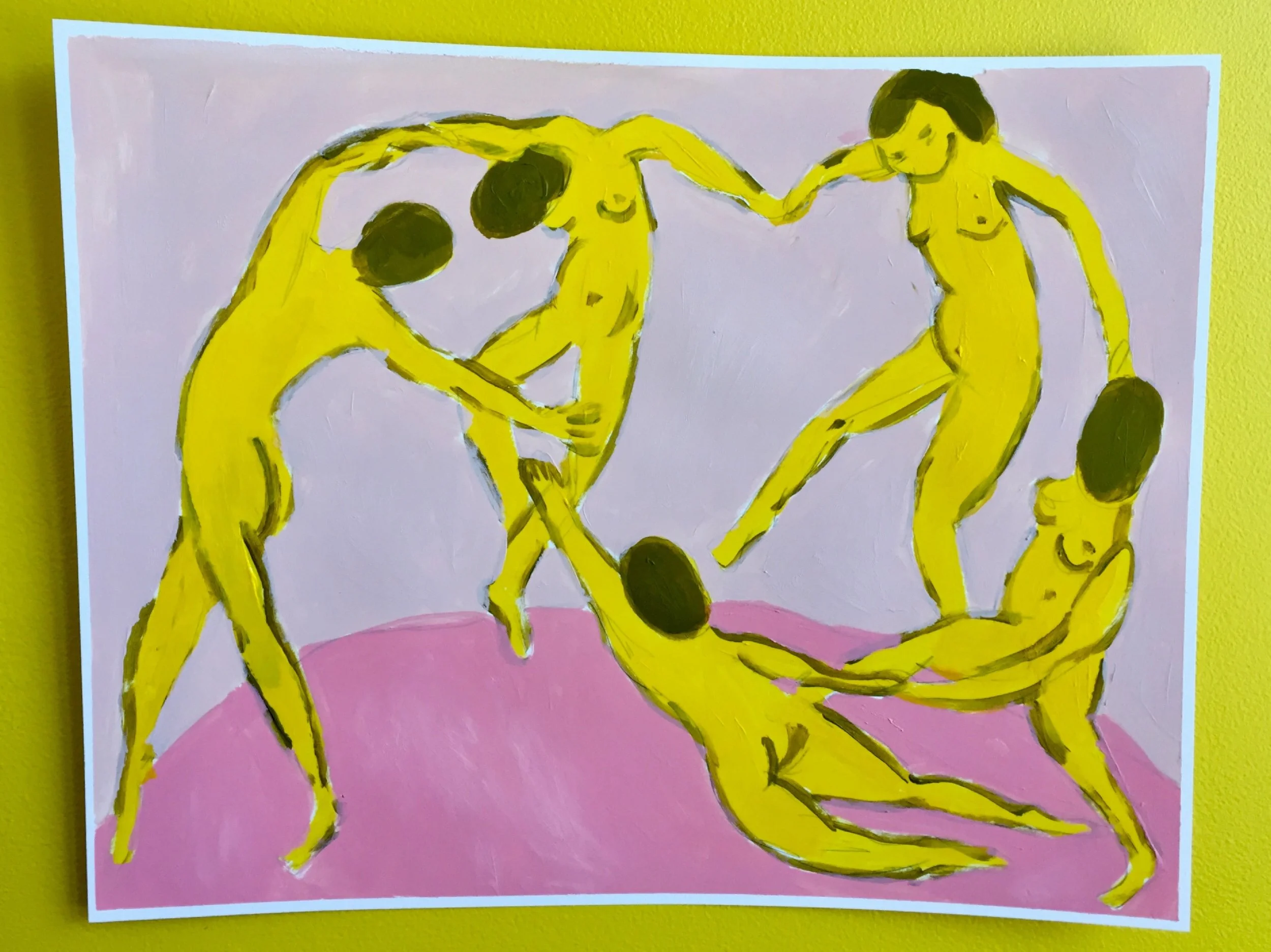Find a painting that you love. I choose La Danse by Matisse because I love the color palette and movement in the piece. Use a color palette that you love, this could be completely different from the original painting. Sketch it out, then begin to paint it in a similar style of the original piece you love.