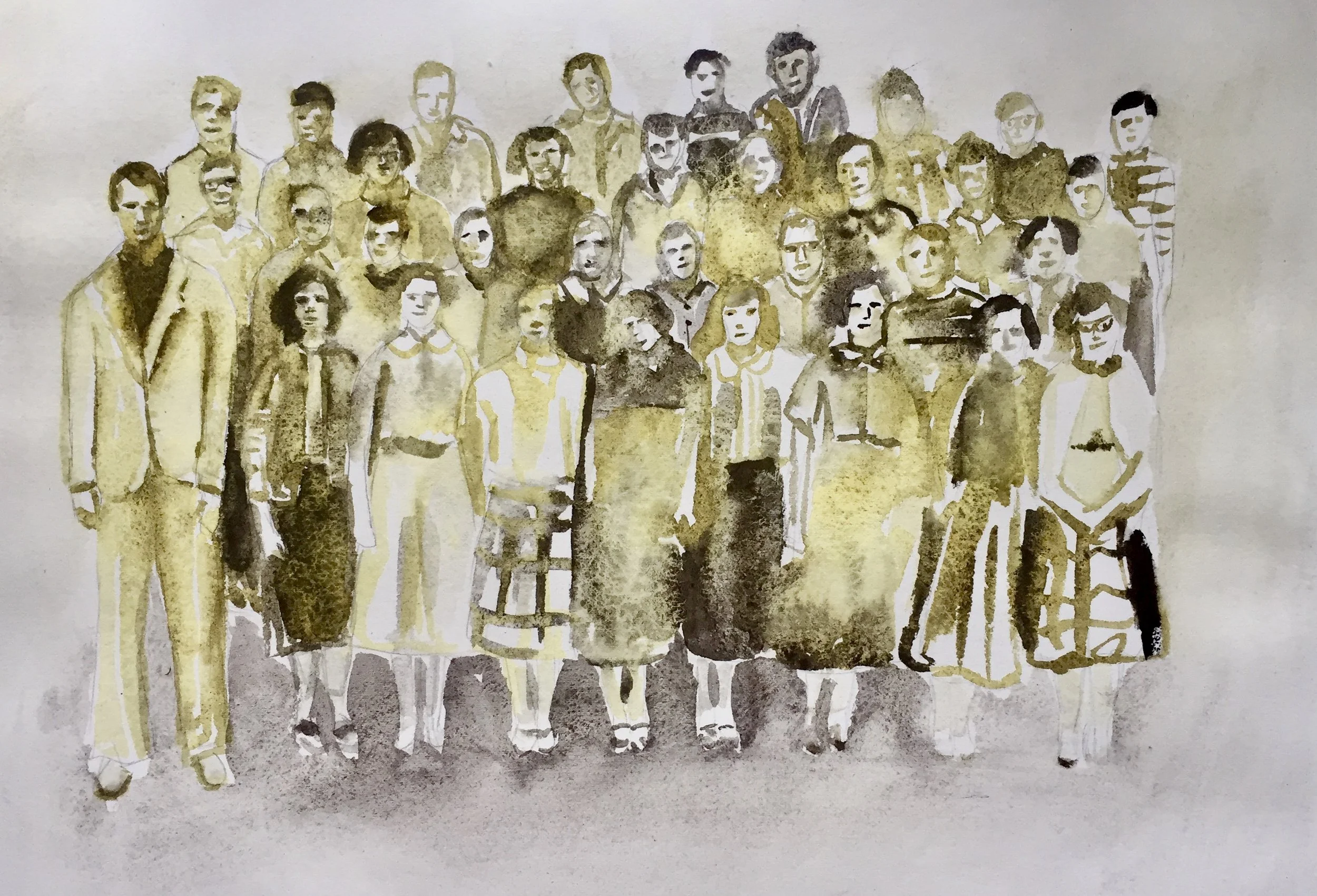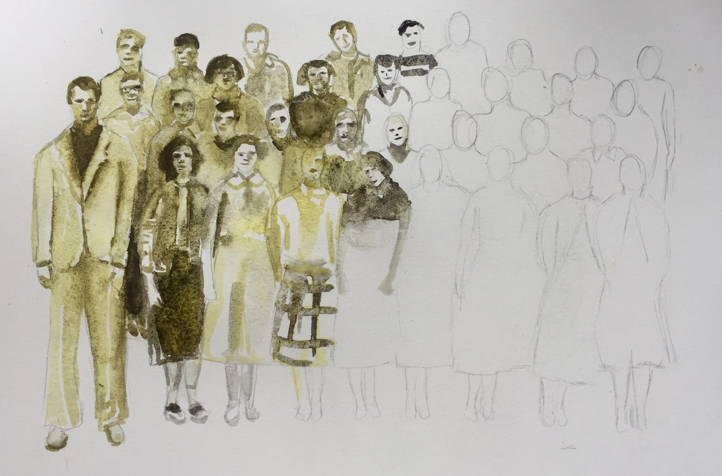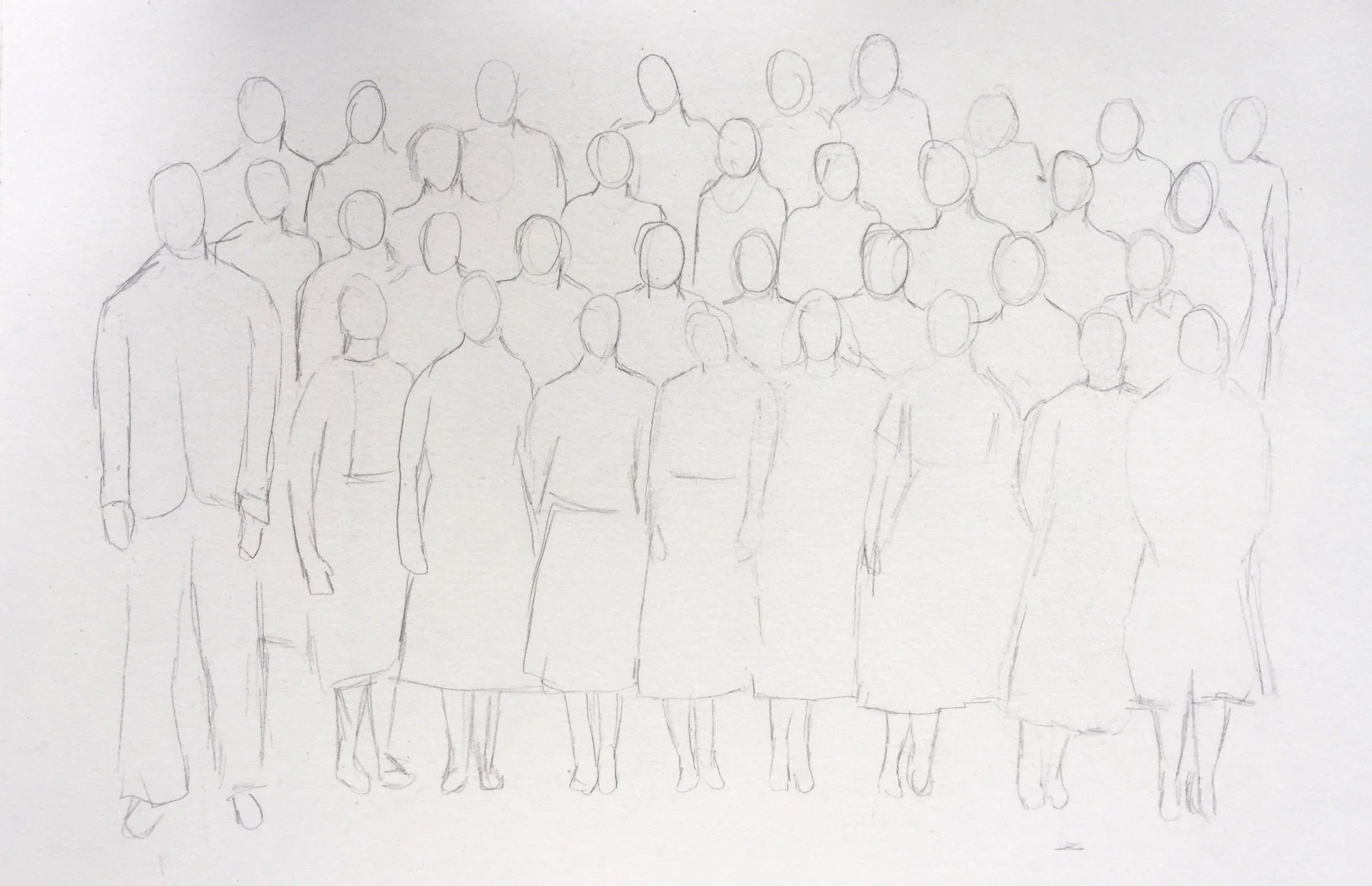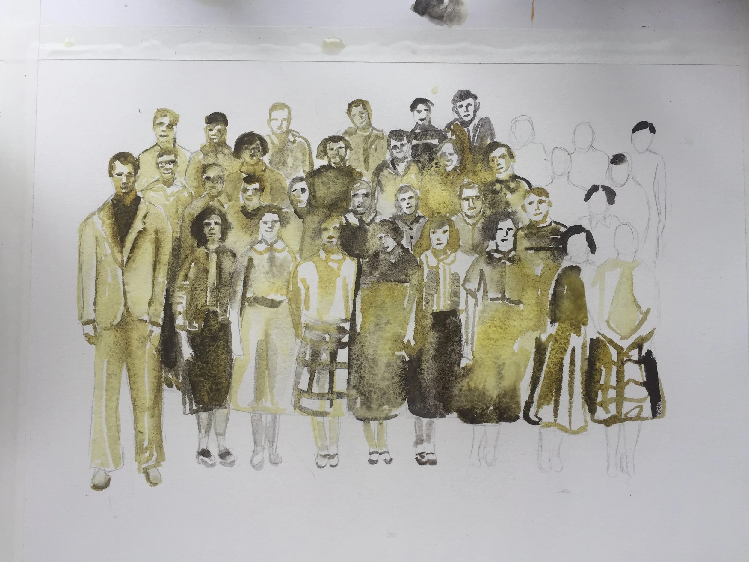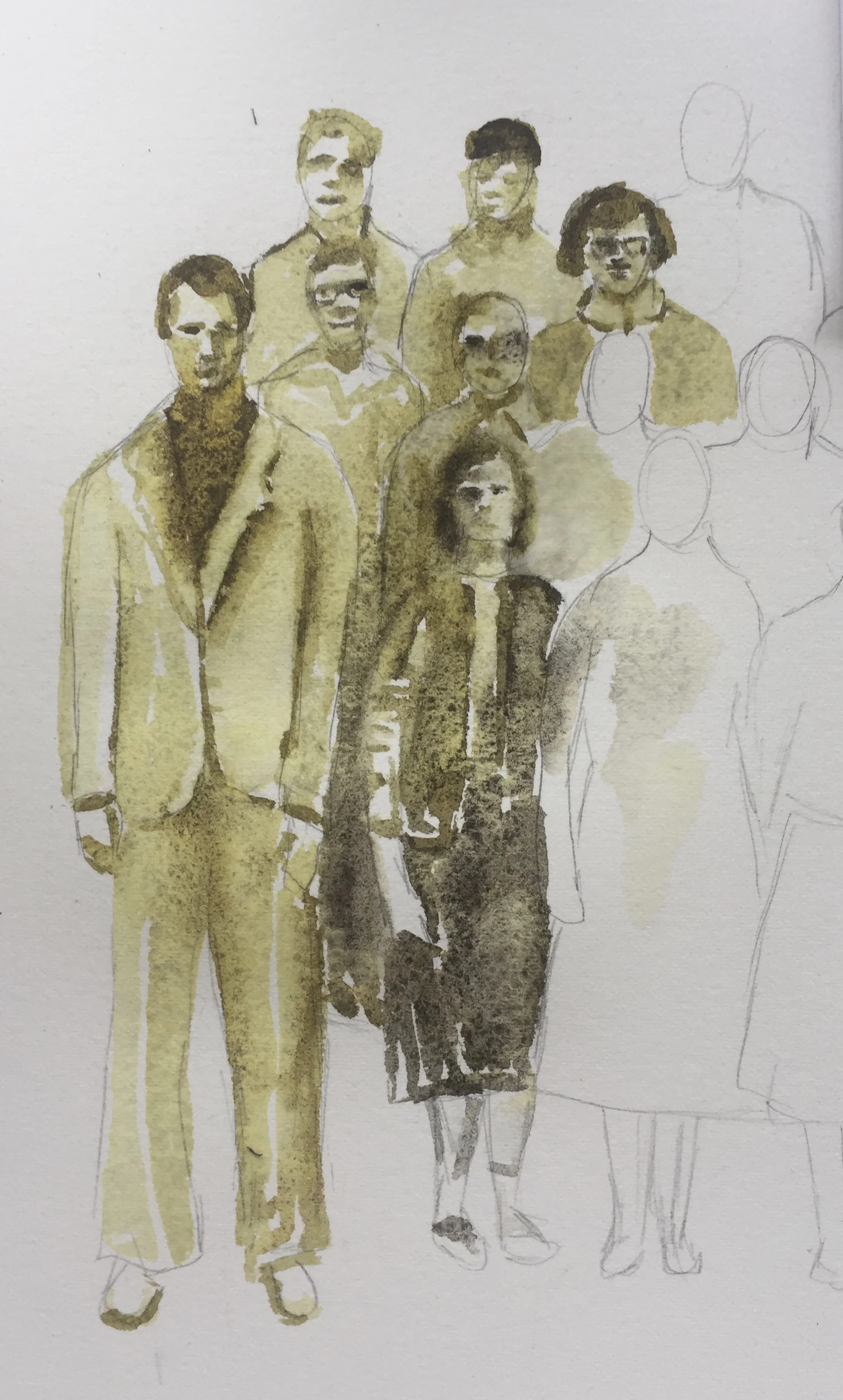 I loved this exercise, even though it felt a bit daunting at first. Fitting all the students and teacher onto the paper I feel is the biggest challenge. I suggest grouping them as a whole to begin, sketching out one large shape and then going in and drawing in each figure as a shape. You won't need to get deep into detail on this exercise, it's more about focusing on the changes in value. Once you get it sketched out you can then begin to use light/dark values to fill the figures in. I worked on 11" x 14" and would love to do this exercise again but larger. I do feel the larger you work the easier it will be when it comes to adding the watercolor.