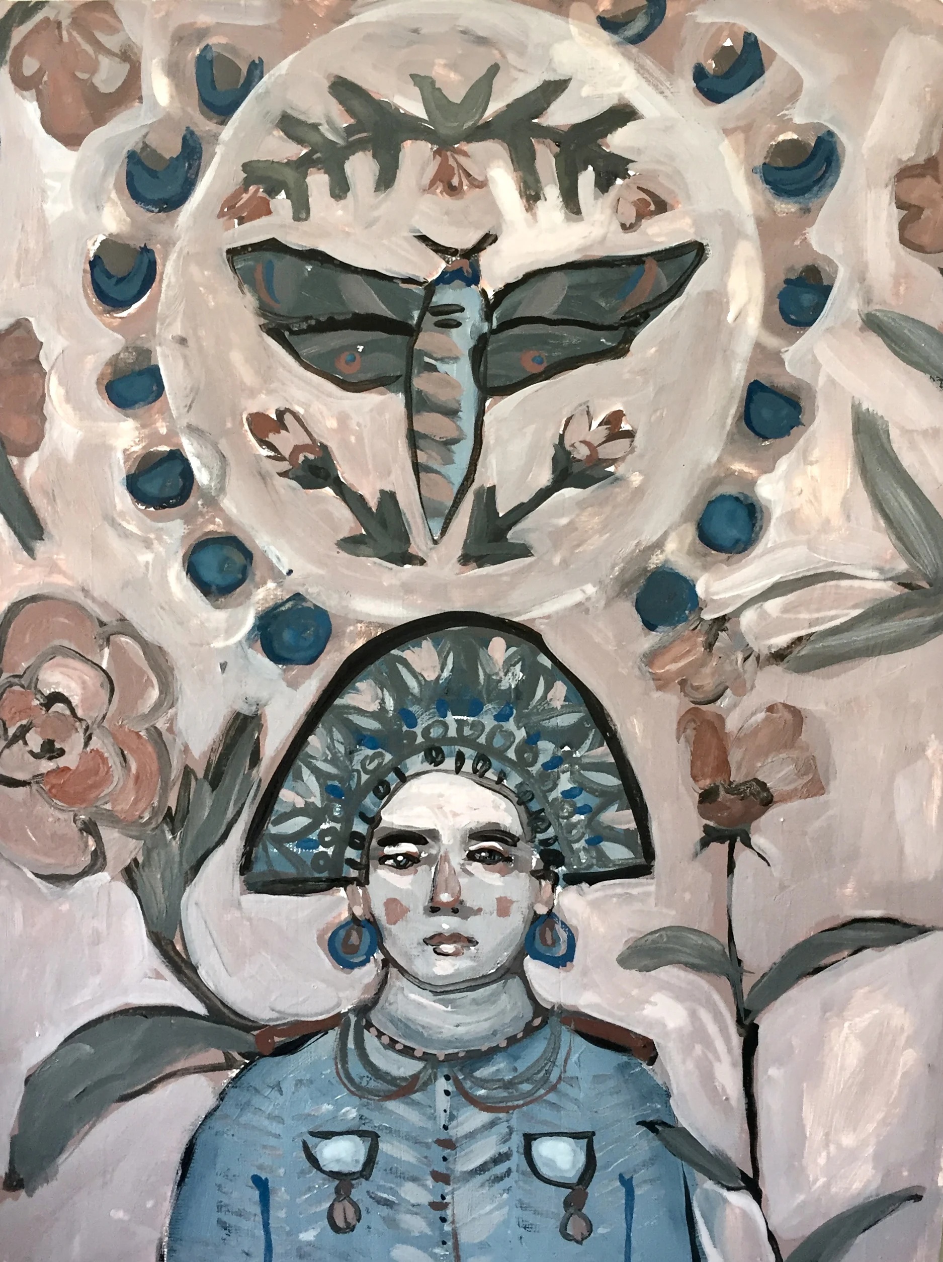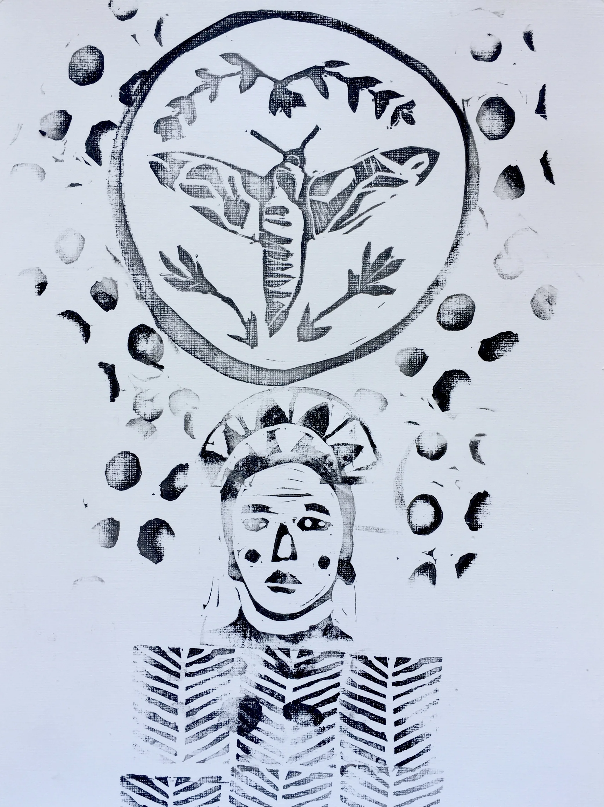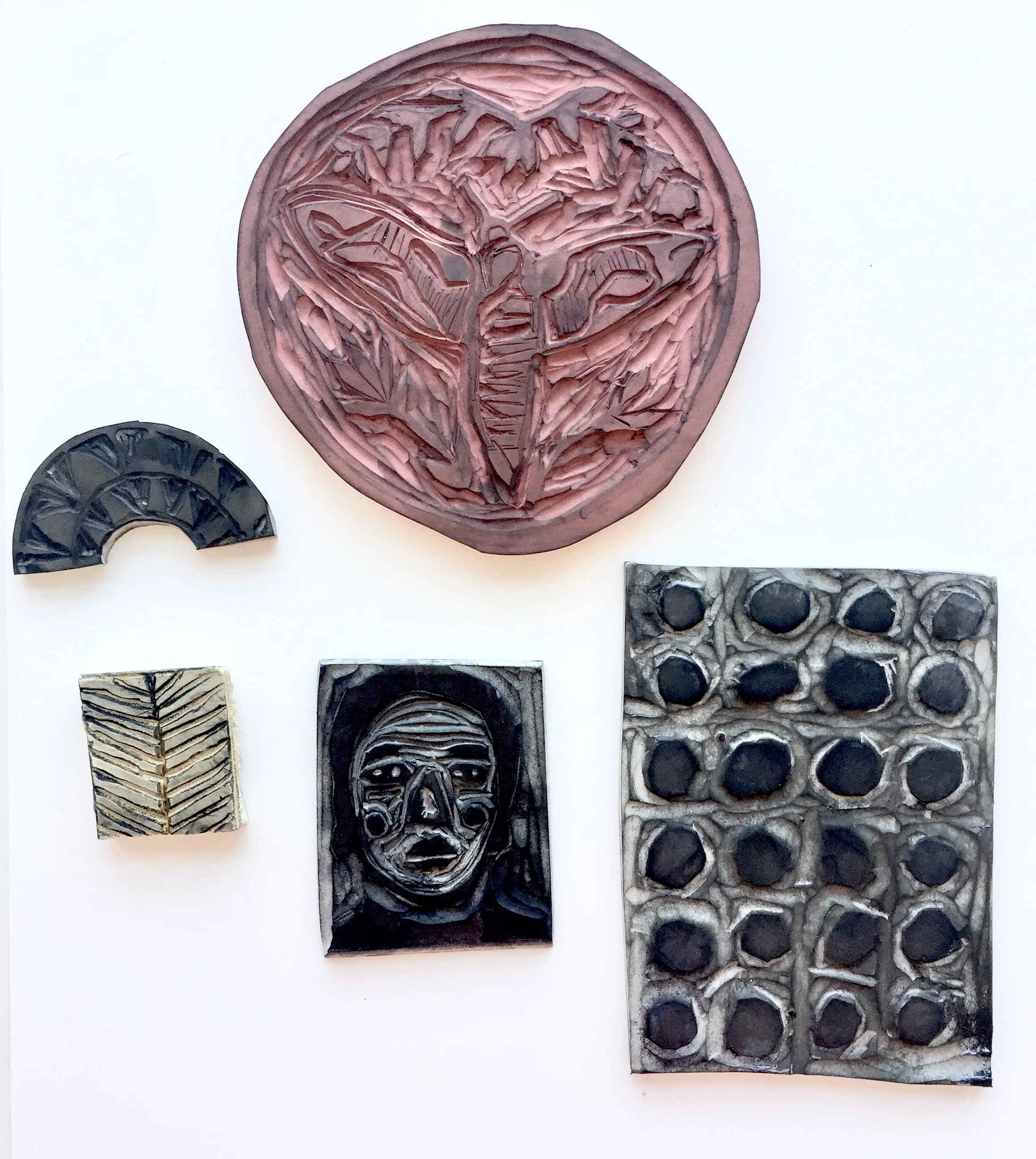 A great thing to do with your rubber stamps is to use them to initiate a painting, or many paintings! For this exercise I used the stamp I carved for the previous lesson in addition to a few other stamps. I stamped them onto acrylic paper and used gouache paints to paint the piece.