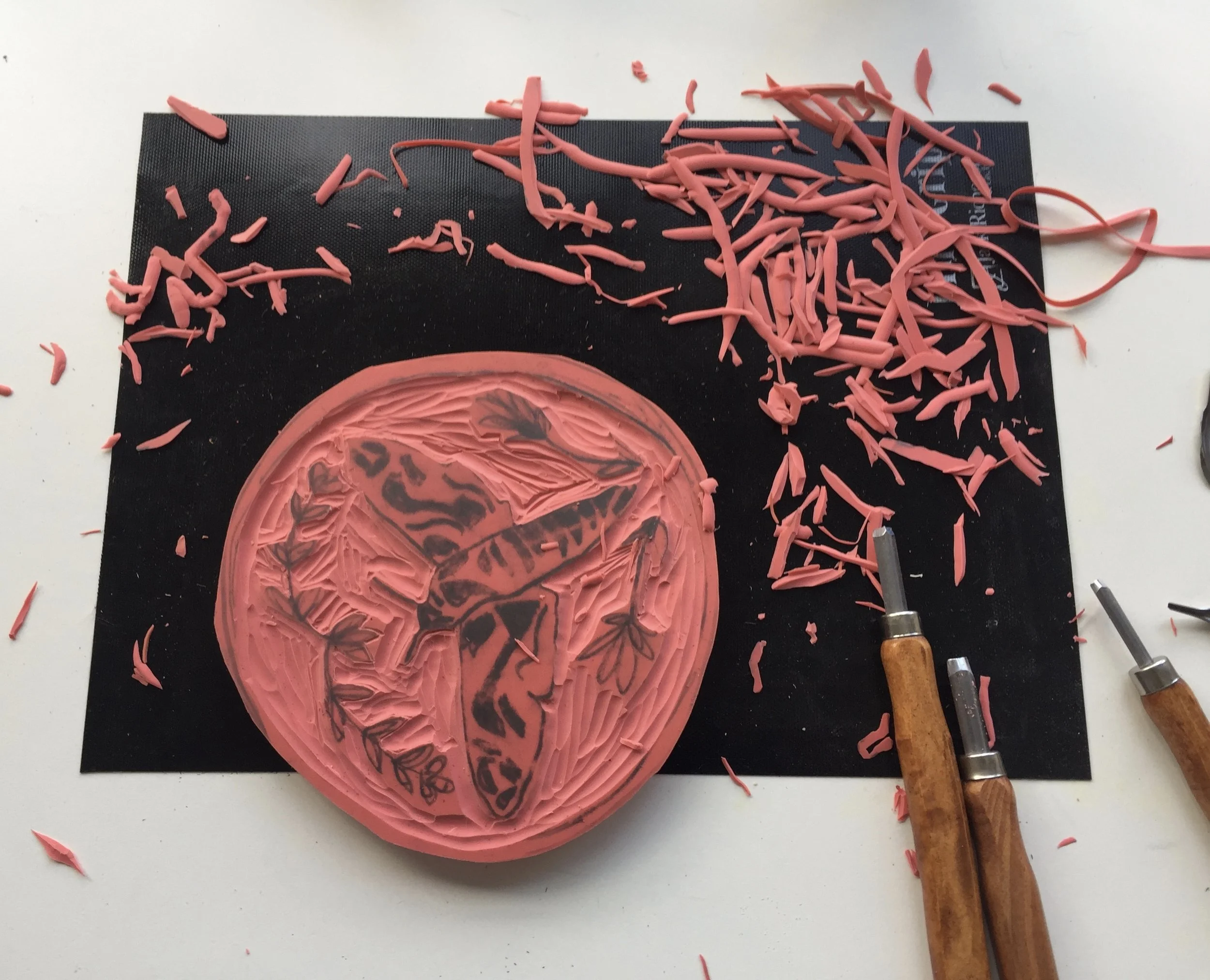 3. You can cut the stamp down to size before or after you carve your design. Begin to carve away the dark areas, taking your time, starting off with small amounts of pressure until you get a feel for carving. Always carve away from yourself. Use a LinoGrip if you feel worried about your stamp slipping away from you. Be careful not to cut yourself.