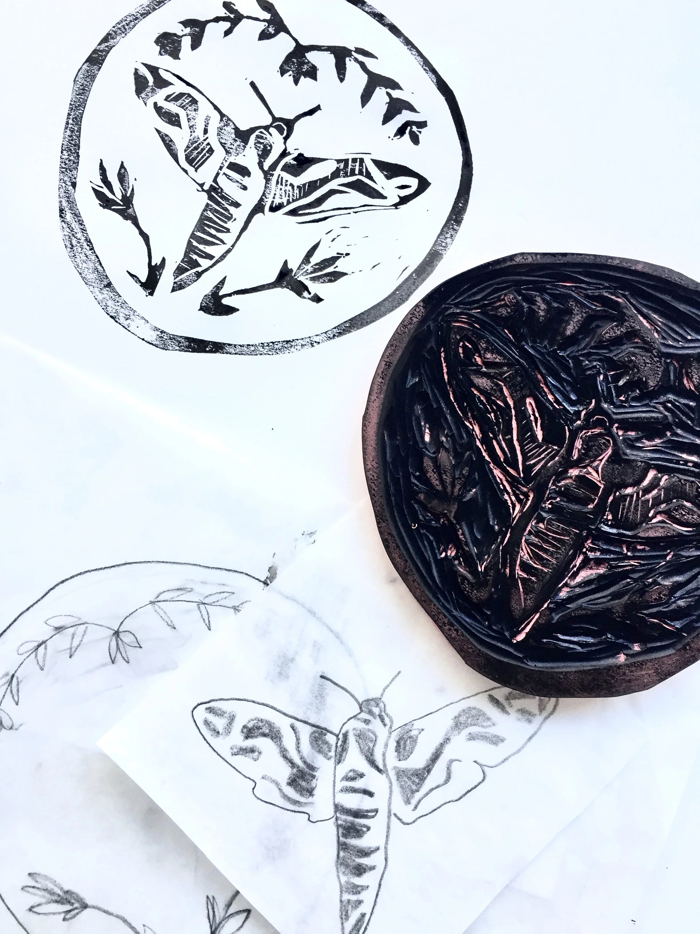 2. Flip your tracing paper over onto your Linoleum and rub the back of the tracing paper to transfer the design. You will need to decide if you want to carve away the positive or negative space.