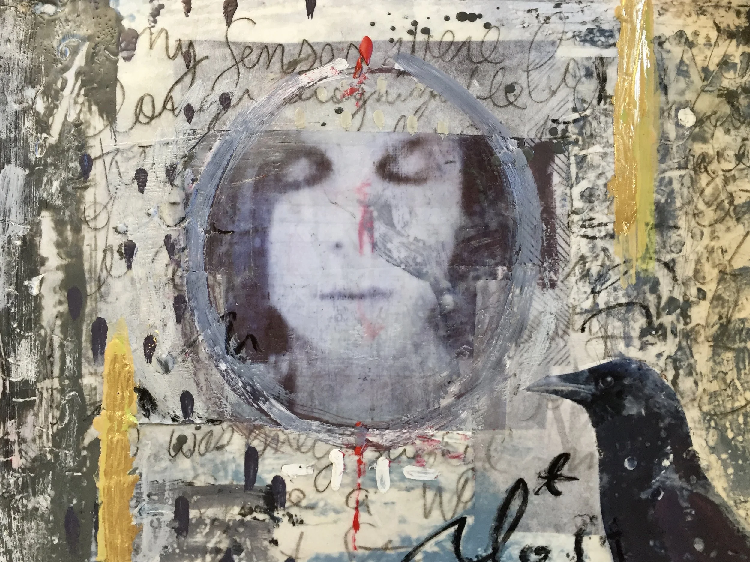 Begin to add layers of collage to your gessoed background. Fusing each layer to the layer underneath. You can make this a self portrait piece, if you'd like to add a photo of yourself to the work.
