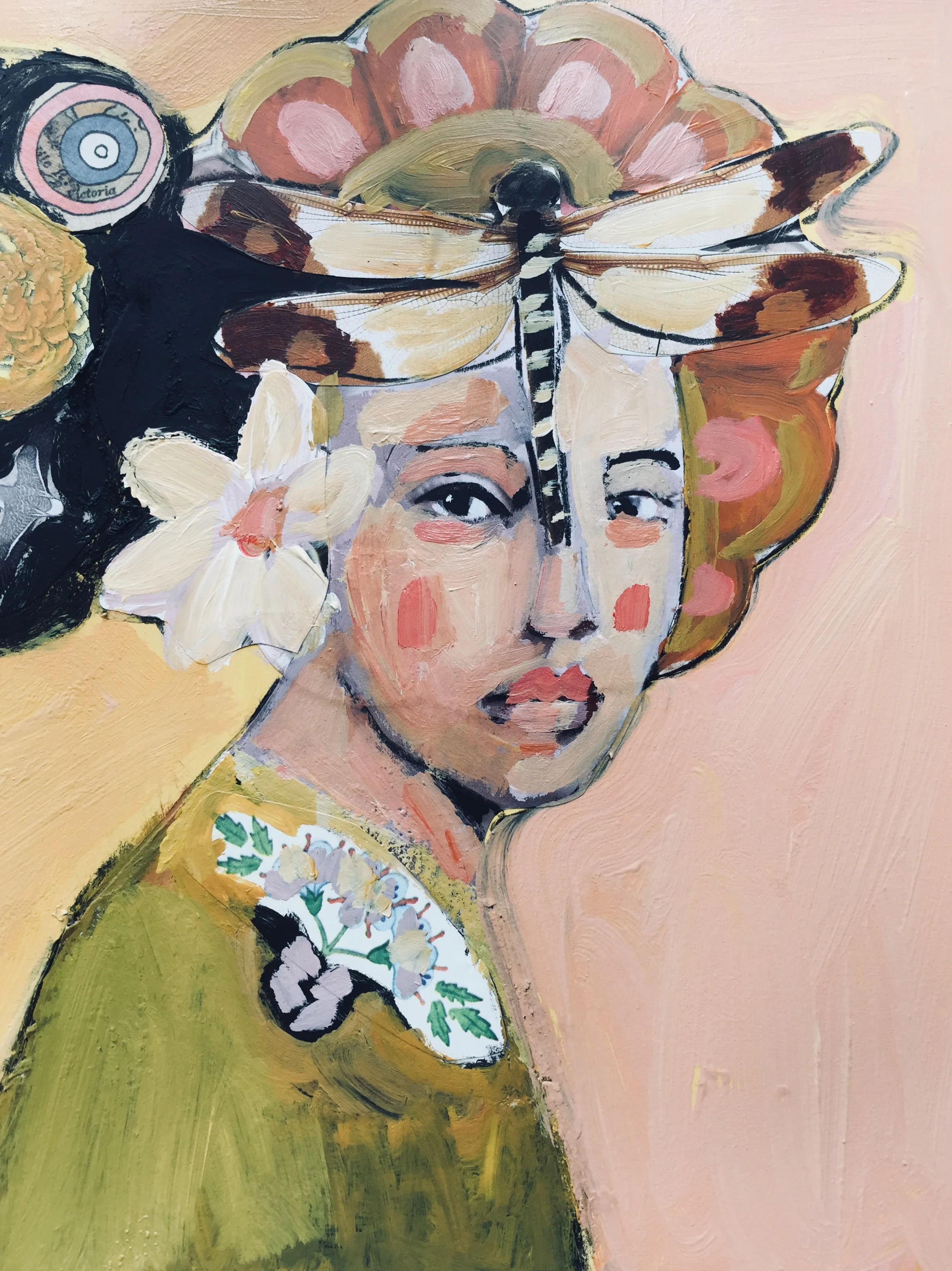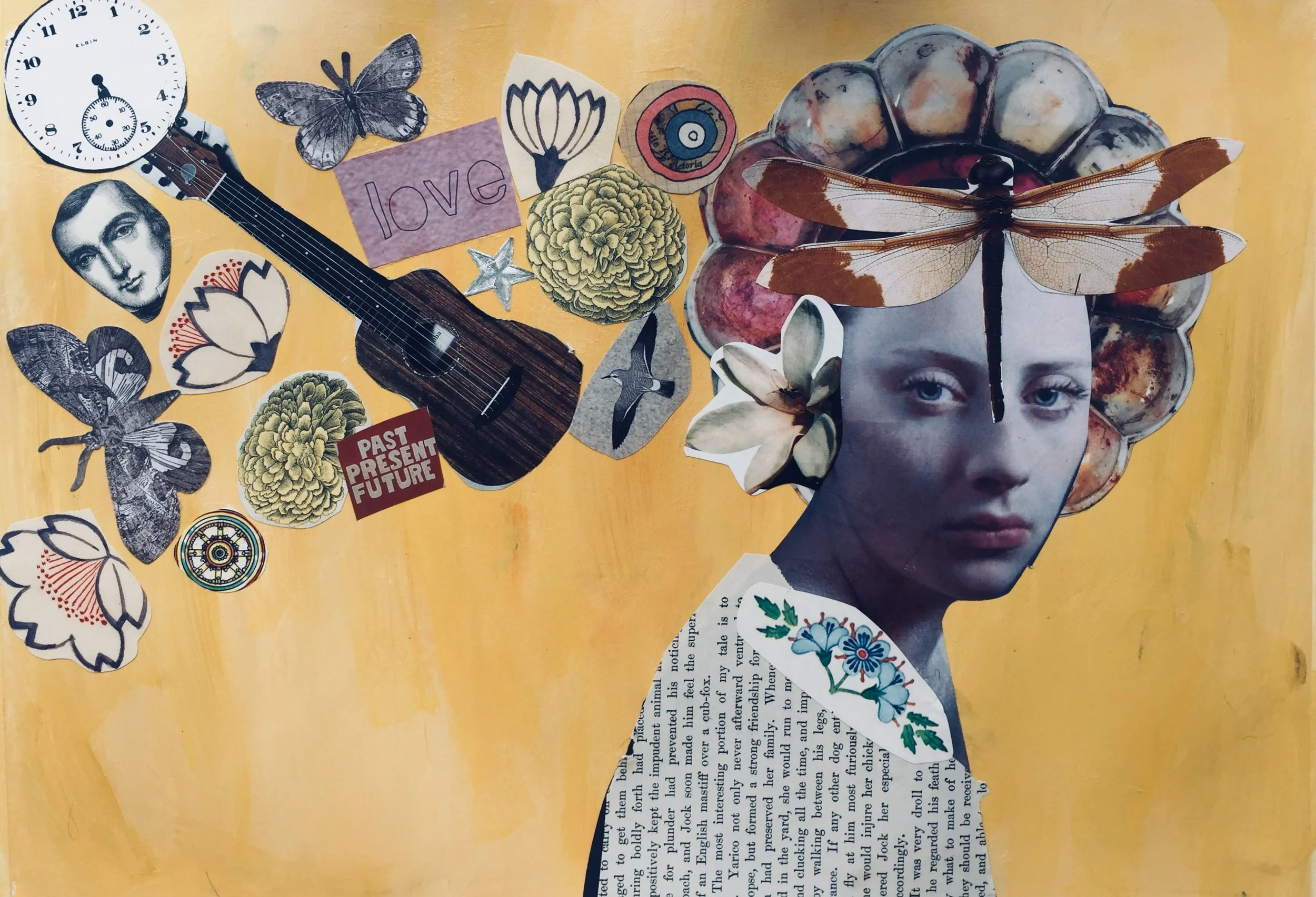 For this exercise, we will be focusing on an archetype that you feel represents you at this point in your life or perhaps another life (past or future). After you have decided on your archetype you are ready to begin. I used collage pieces for my example that I felt went with the Creative Archetype that I identify with. You can start with collage pieces or with a drawing if you don't want to use collage. Before I glued my collage pieces down I painting in the background a yellow color. From there I arranged the collage pieces and glued them down. I then used a Stabilo pencil to outline some of the areas on the piece. From there I began to paint on and around the collage pieces to make the whole piece more cohesive. If you are ambitious you could so a piece for all of the Archetypes.